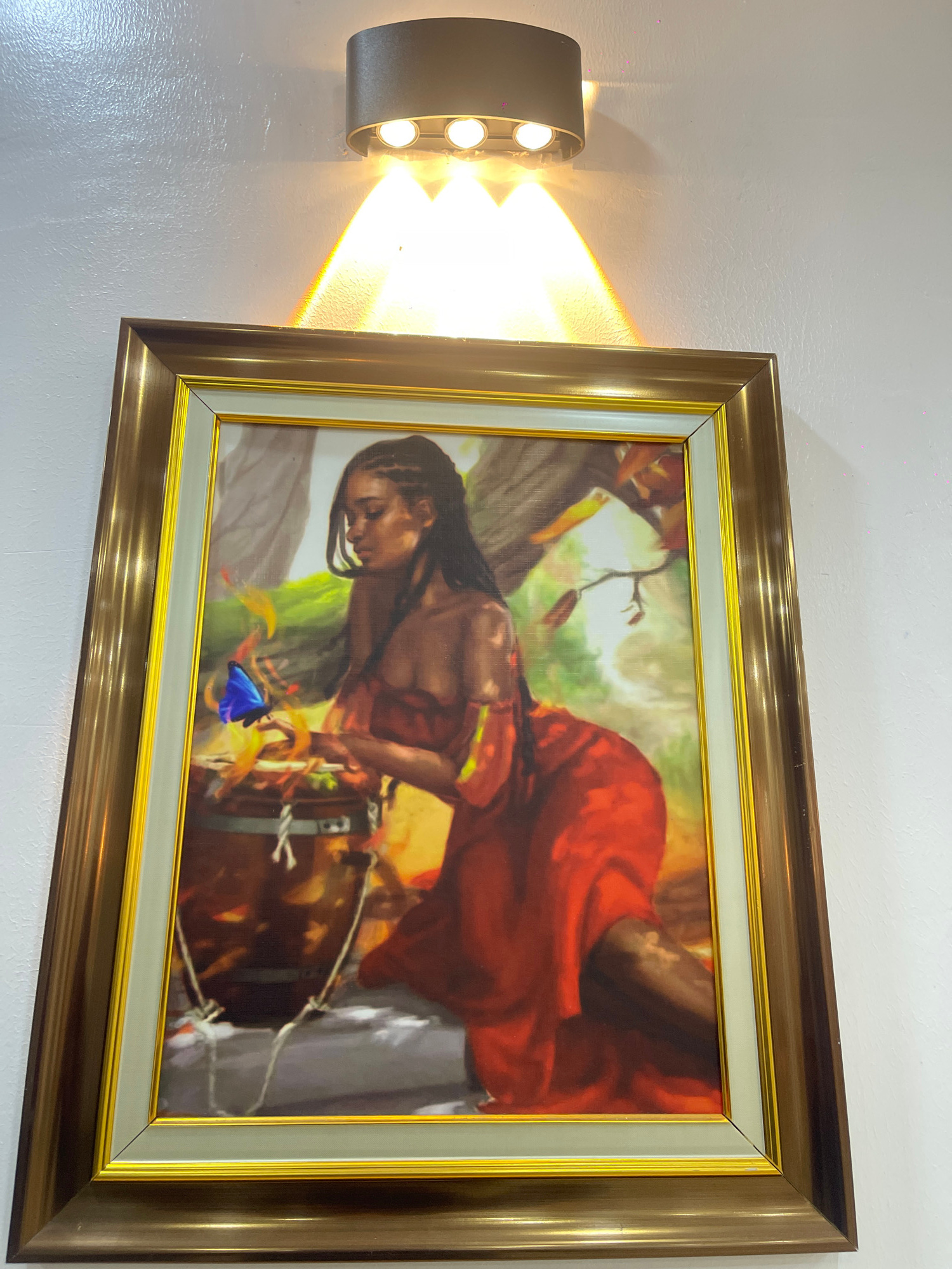 A framed portrait hangs on a wall, illuminated by a nearby light fixture. The painting depicts a woman in a red dress tending to something, possibly fishing. The frame is ornate, with gold and brown t…read more