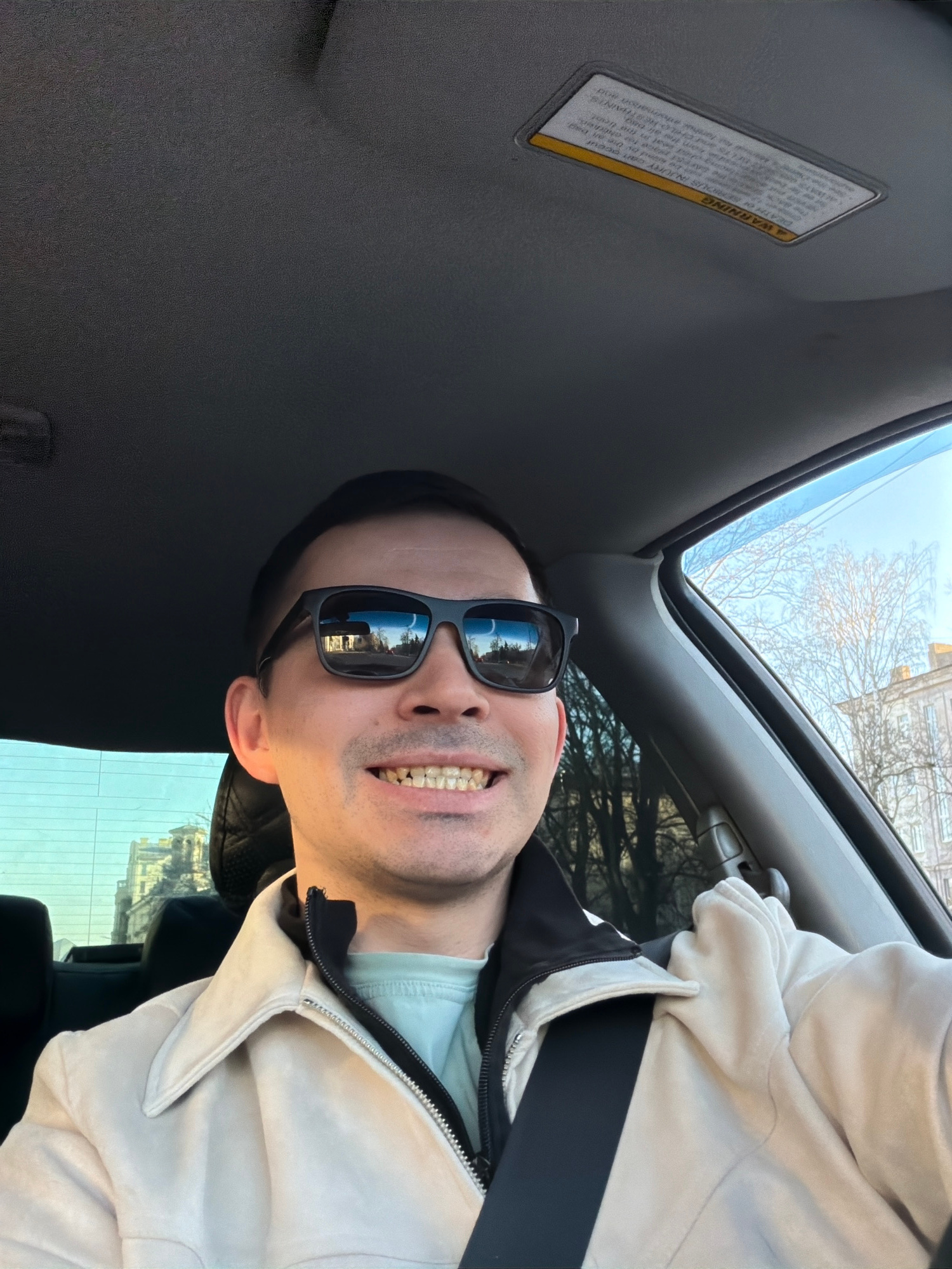 The image is a selfie taken from inside a car, showing a man smiling broadly at the camera. The man's head is tilted sideways, wearing black sunglasses that reflect a bright outdoor scene with buildinβ¦read more