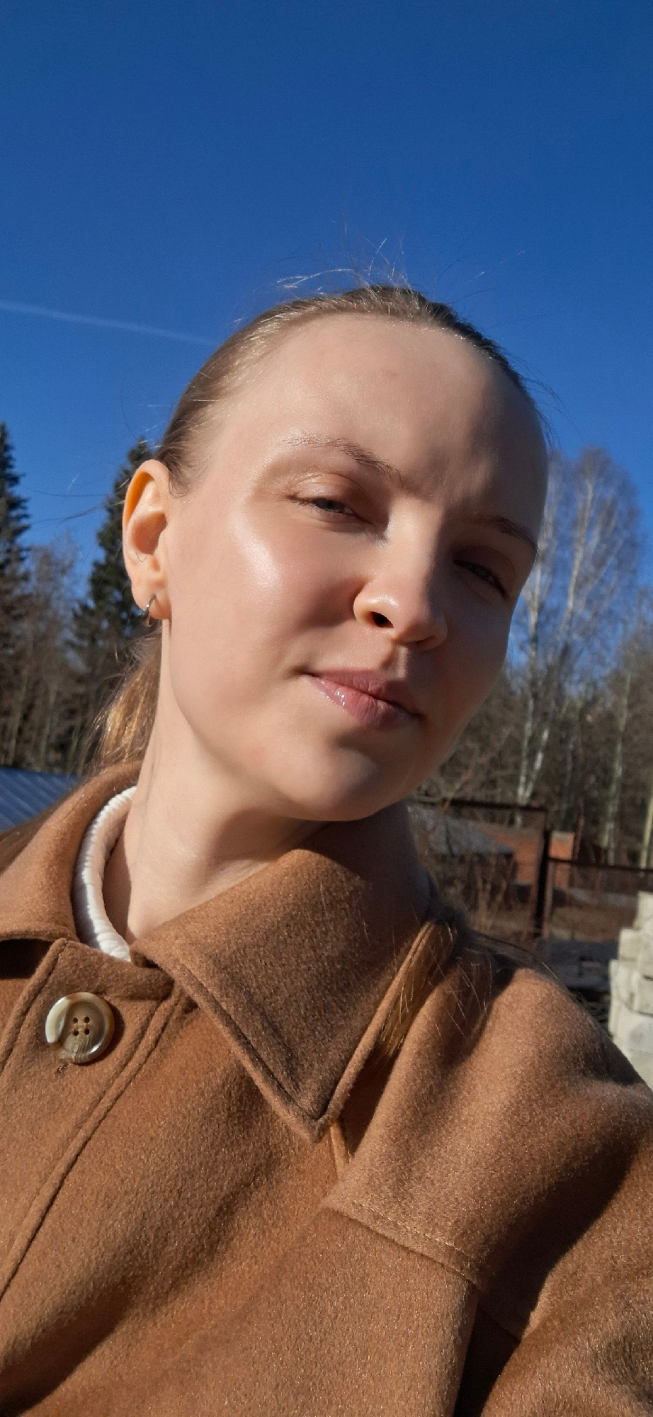 A young woman with fair skin and blonde hair poses outdoors in Chaikovsky, Russia. She wears a brown wool coat with a white collar and has her eyes closed. The sky is blue, and trees are visible in thβ¦read more