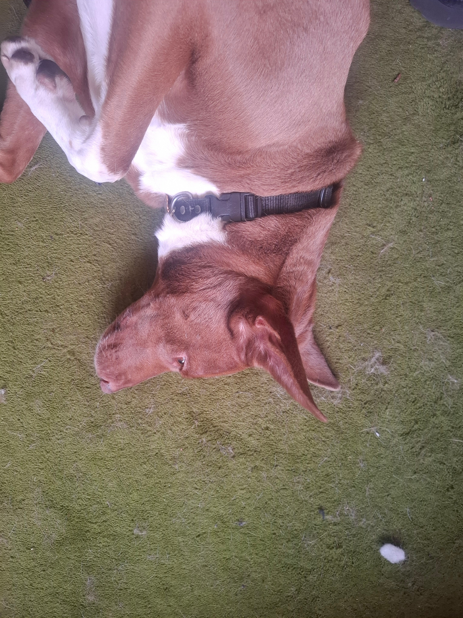 A brown and white dog is lying on its back on a green carpet. The dog is wearing a black harness. The location is Naucalpan de Juárez, Mexico.