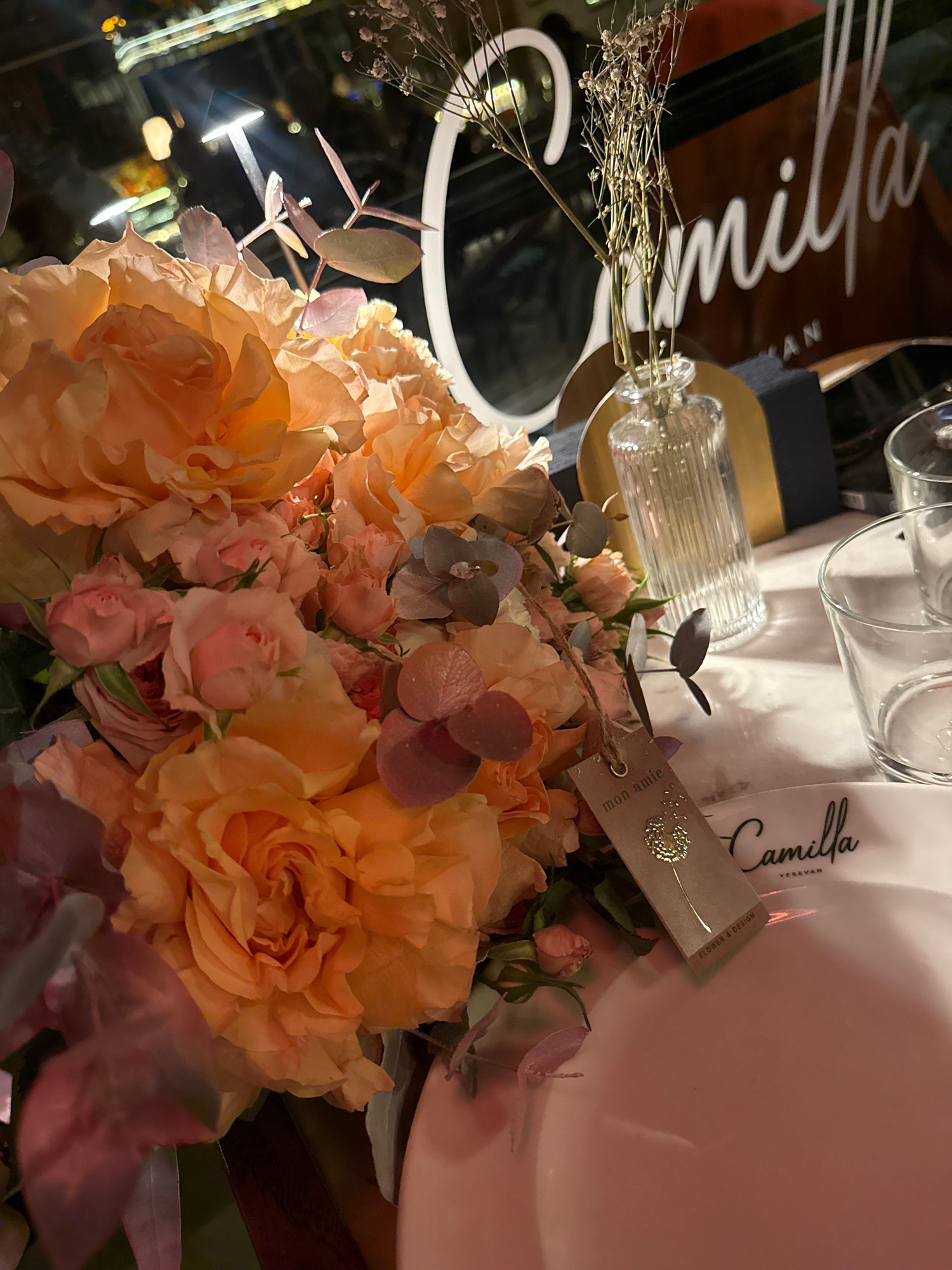 The image depicts a table setting, likely in a restaurant, featuring a floral centerpiece. The arrangement is composed of peach and pink roses with sprigs of dried flowers and purple foliage accents.…read more