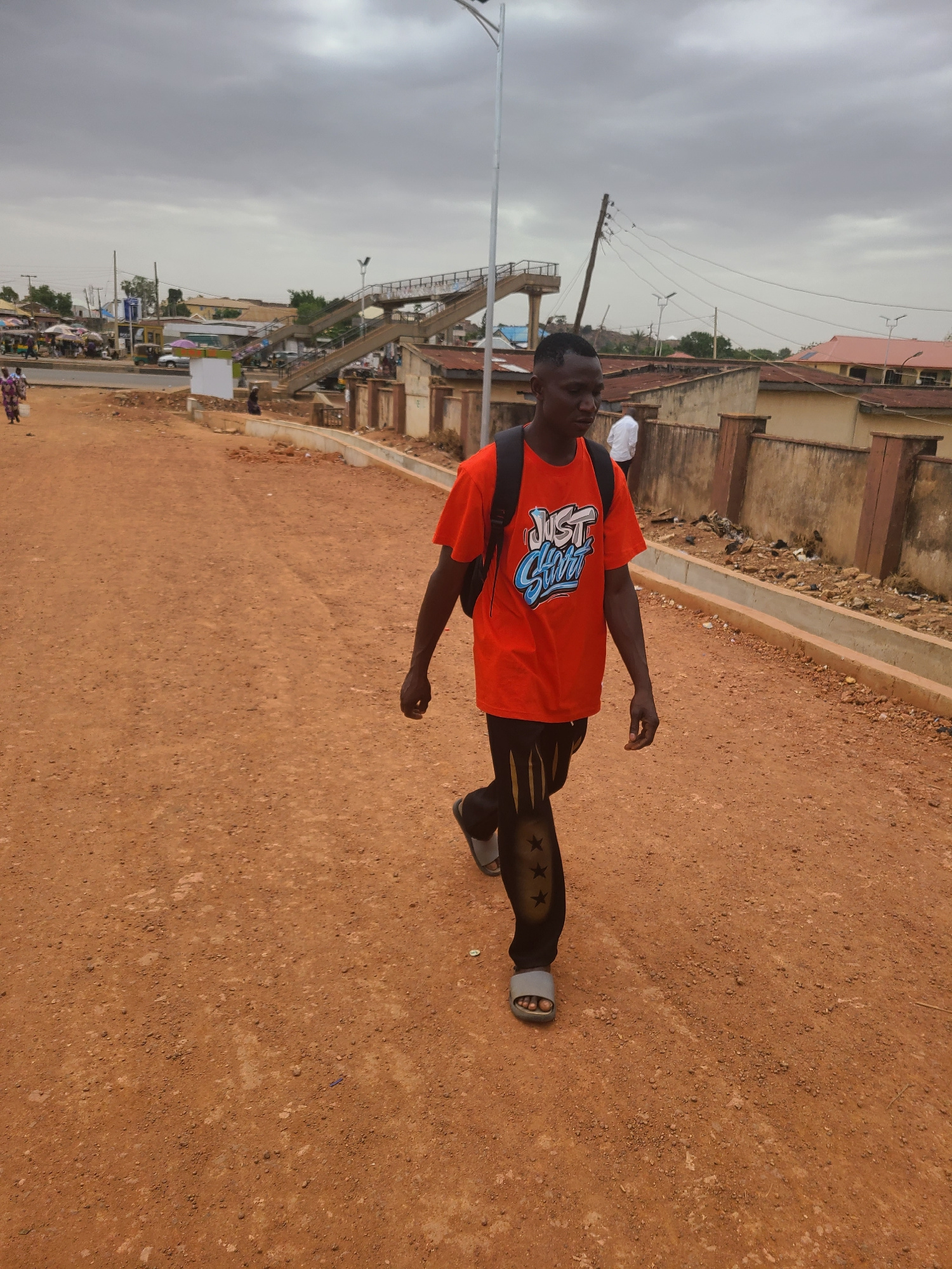 A young man wearing a red t-shirt with blue lettering, black patterned leggings, and slides stands on a dusty red-brown surface. He has a black backpack on. In the background is a cityscape under a cl…read more