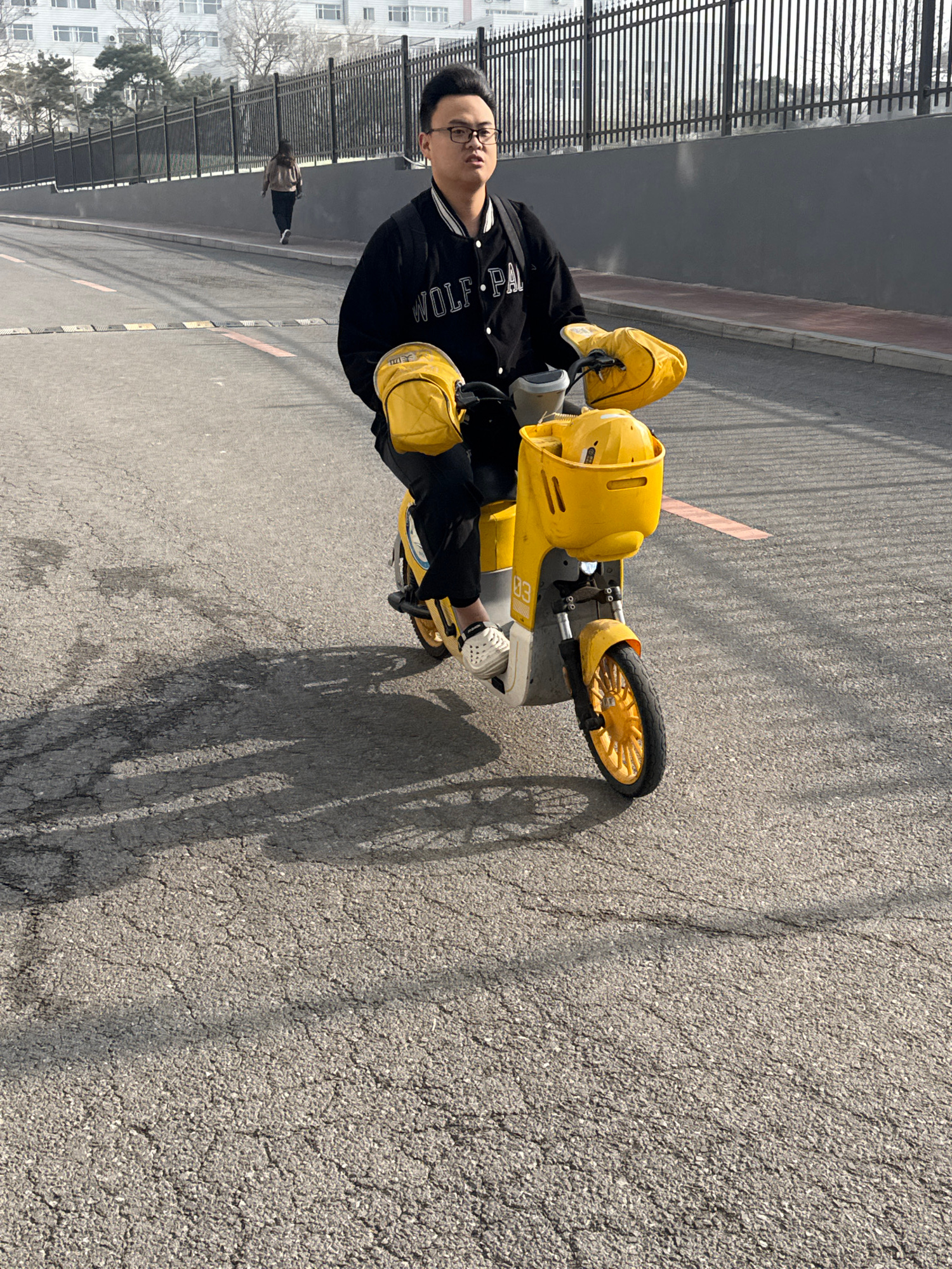 A man with glasses is sitting on a small yellow bicycle in Zhongtun, China. The bicycle is designed for children and includes a helmet and additional storage. The man is wearing a black jacket with "W…read more