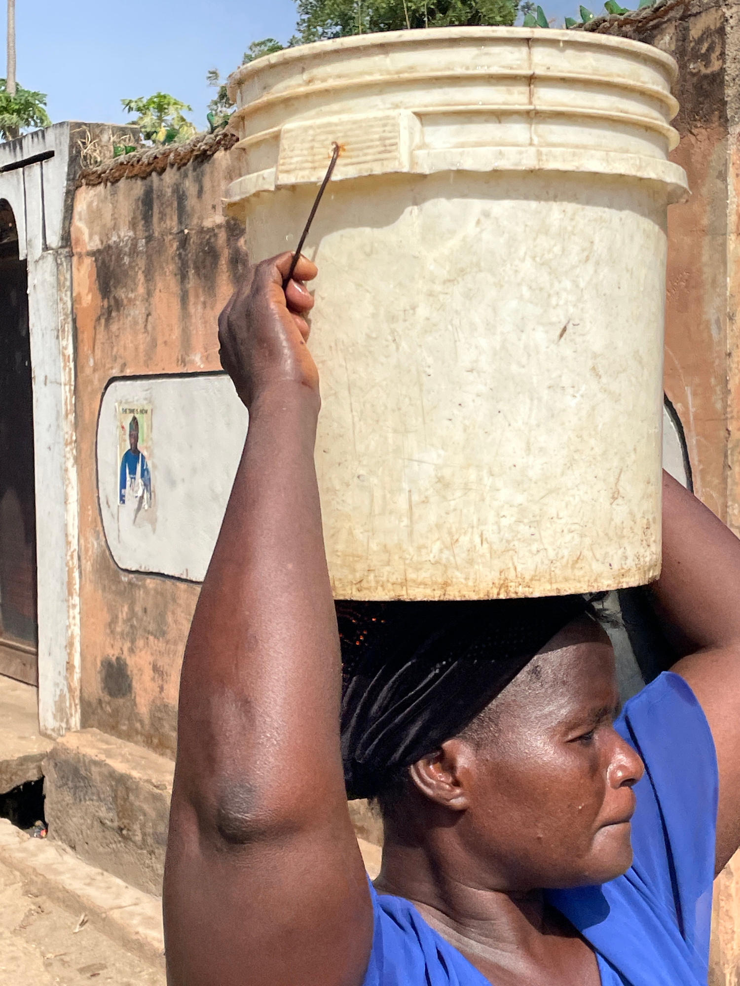 An adult person with dark skin, wearing a blue top and black braided hair, is depicted in an outdoor setting, likely in Jos, Nigeria. The individual is positioned with their head and upper body near o…read more