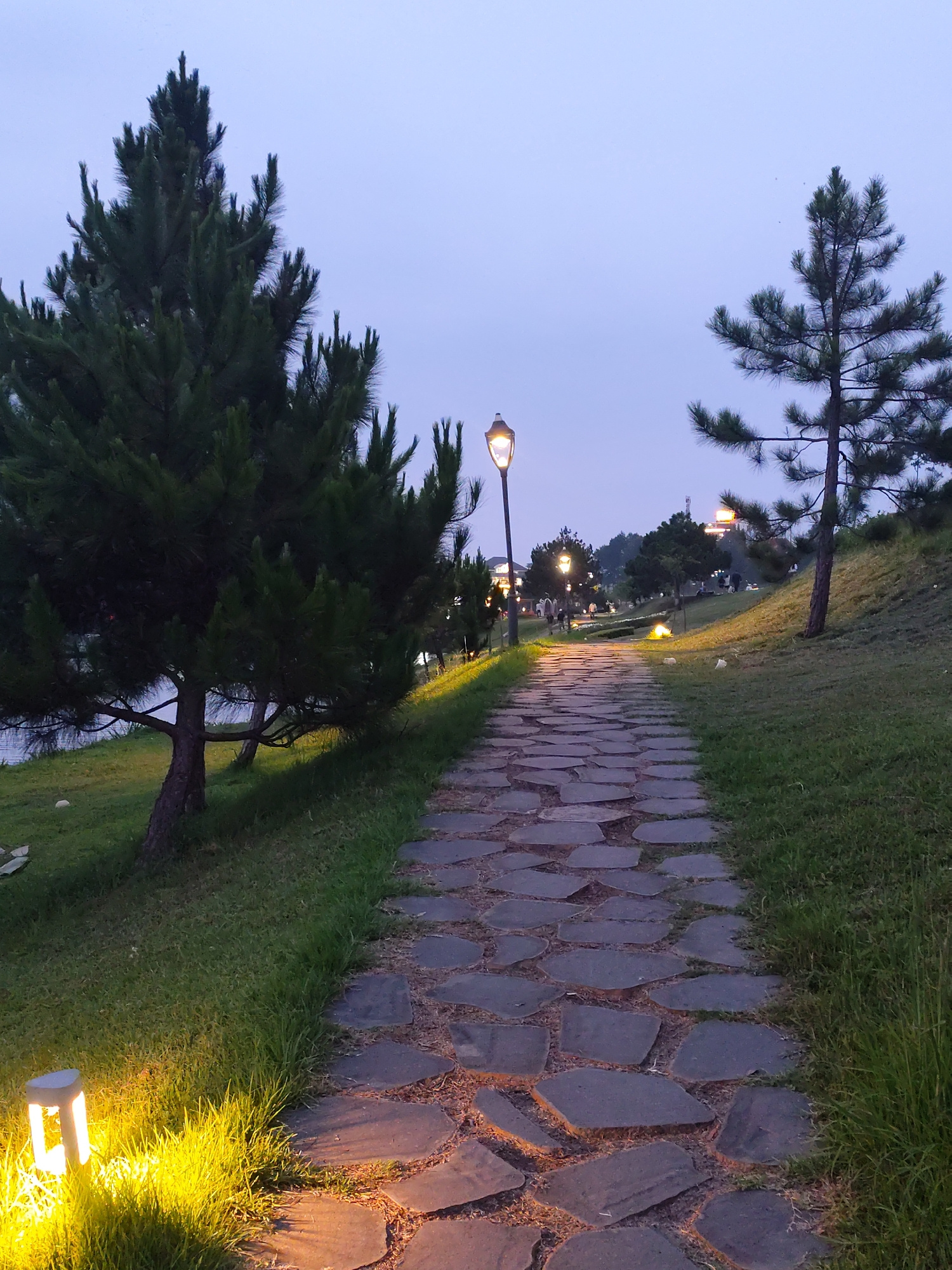 This media file captures a serene evening scene in a park or garden in Da Lat, Vietnam, at dusk. A winding pathway, constructed from irregularly shaped stone slabs, dominates the foreground and recede…read more