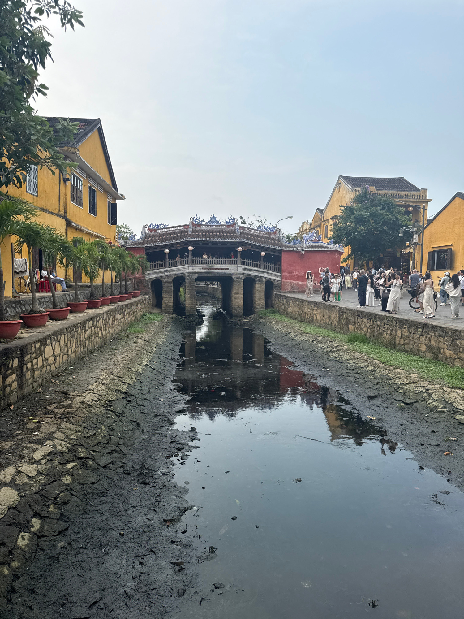 This image, rotated 90 degrees clockwise, depicts a picturesque scene from Hội An Ward, Vietnam, centered around its distinctive Japanese Covered Bridge. The bridge, with its traditional ornate tiled…read more