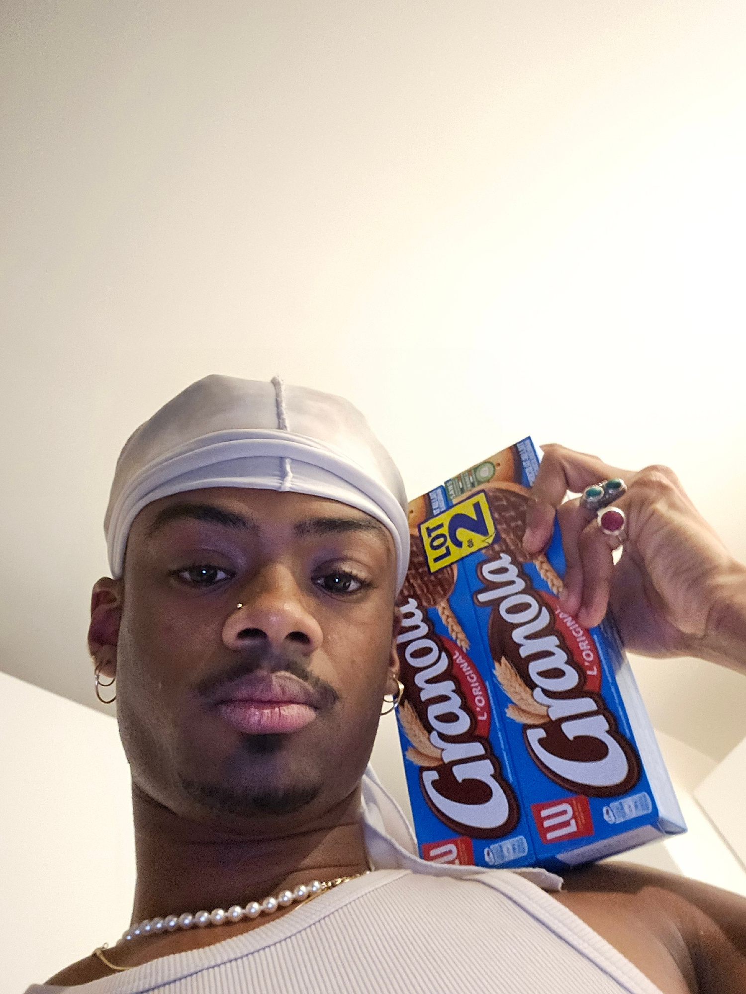A close-up, downward-angled shot shows a person holding two boxes of LU Granola L'Original cookies. The person wears a white durag, a white tank top, and pearl and gold necklaces. They also have a gol…read more