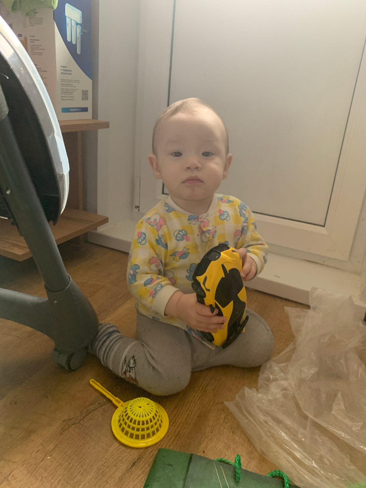A baby sits on a wooden floor, holding a yellow toy car with black detailing. The baby wears a light yellow pajama top with a pattern of flowers and bears, and gray pants with patterned socks. To the…read more