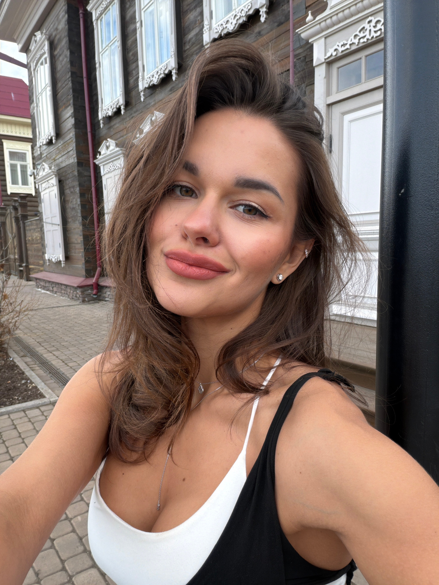 A selfie photograph shows a woman with shoulder-length brown hair, fair skin, and light brown eyes. She is smiling slightly, wearing a black and white tank top, a silver necklace, and earrings. The ba…read more