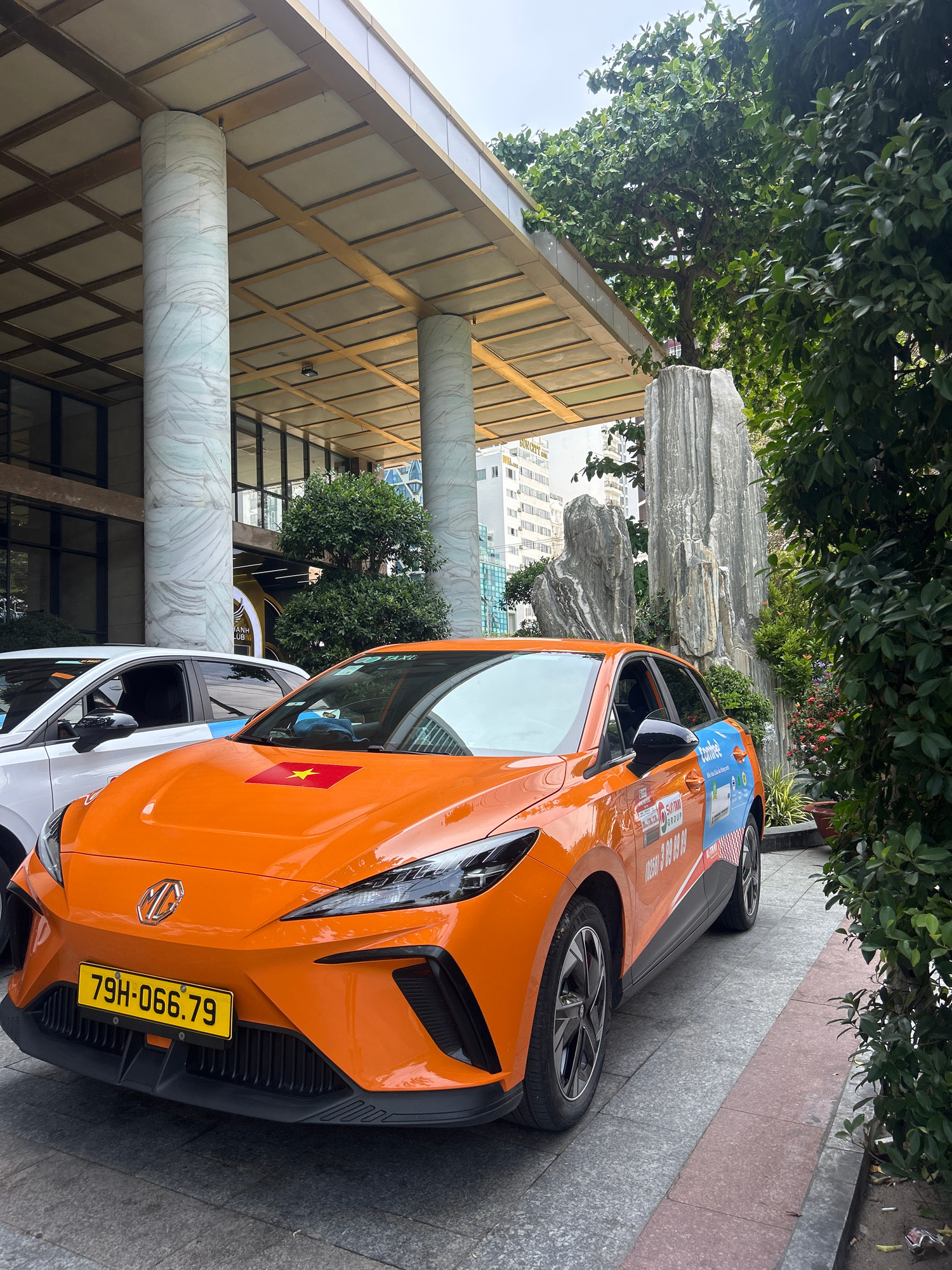 An orange MG car is parked front-first under the canopy of a building entrance during daytime in Nha Trang, Vietnam. The car, with a vibrant orange paint job, features a Vietnamese flag sticker (red w…read more