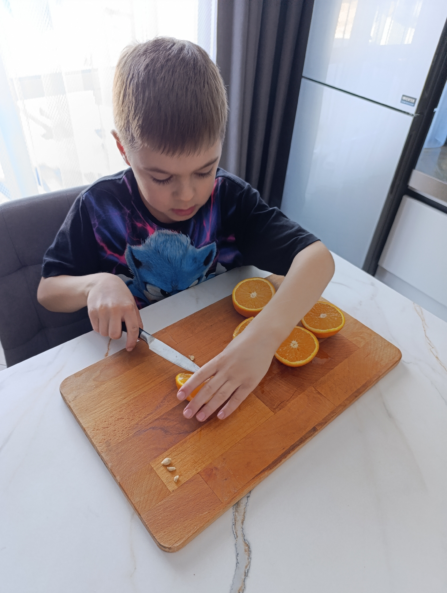 The image captures an indoor scene in Chaikovsky, Russia, likely a kitchen or dining area. A young male child, approximately 6-10 years old, with short light brown hair, is seated at a white marble-pa…read more