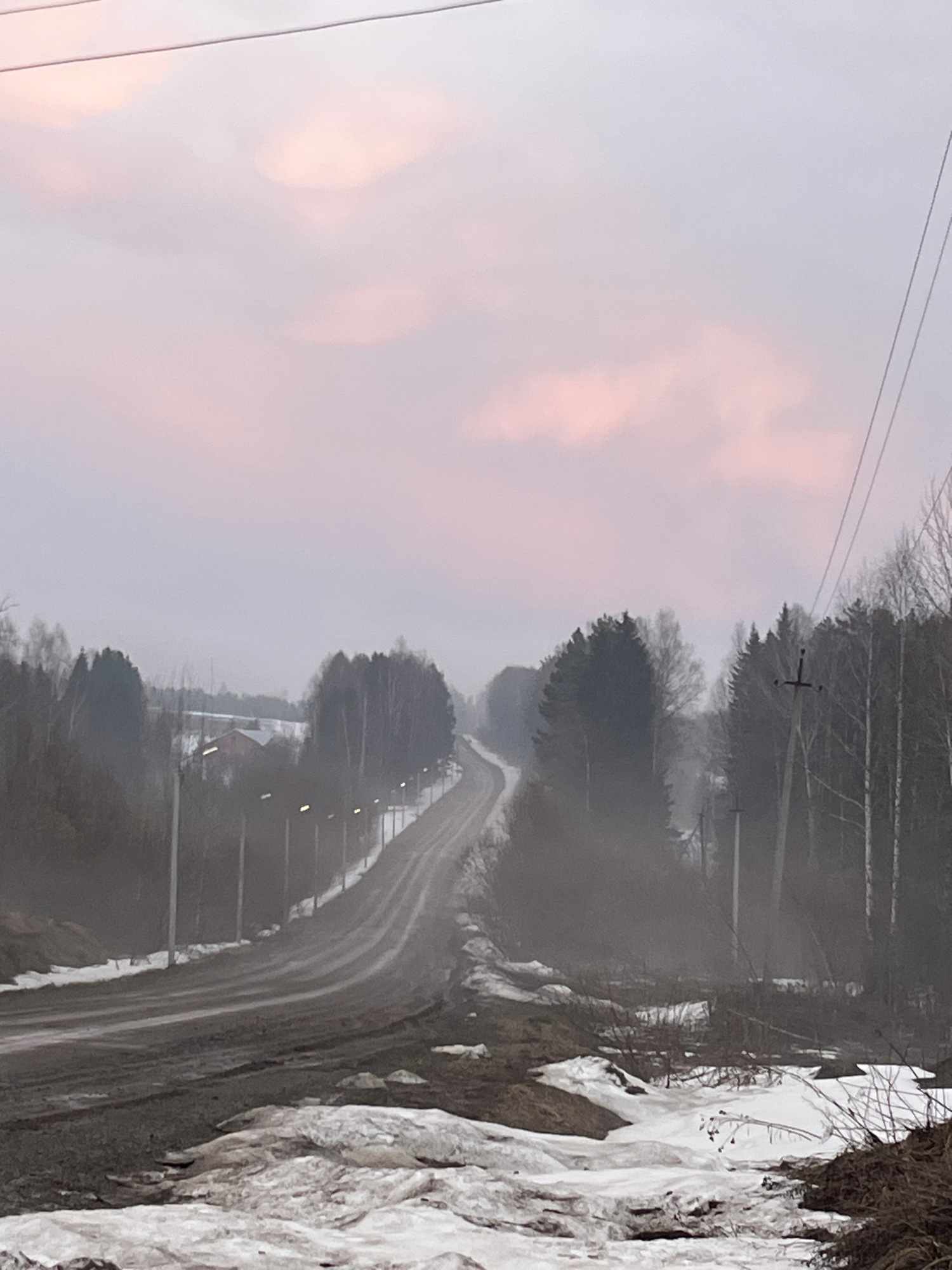 The image depicts a misty, rural road in Kamennyi Kliuch, Russia. The road curves into the distance, flanked by trees and utility poles. Patches of snow and ice are visible along the roadside. The sky…read more