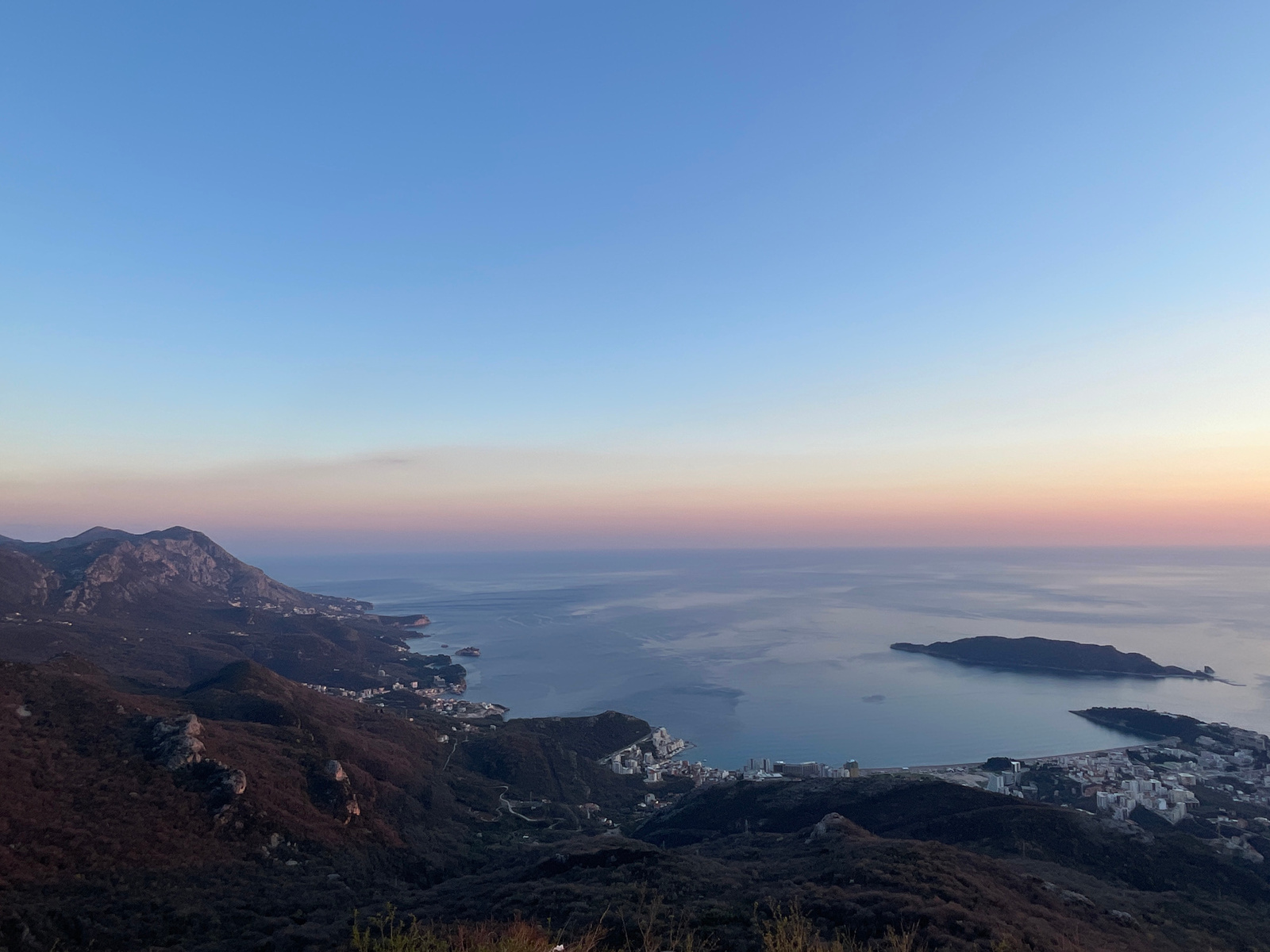 An aerial view captures the Brajici, Montenegro landscape at dusk. The scene includes mountains leading down to a coastline with buildings and beaches. An island sits offshore in the water. The sky bl…read more