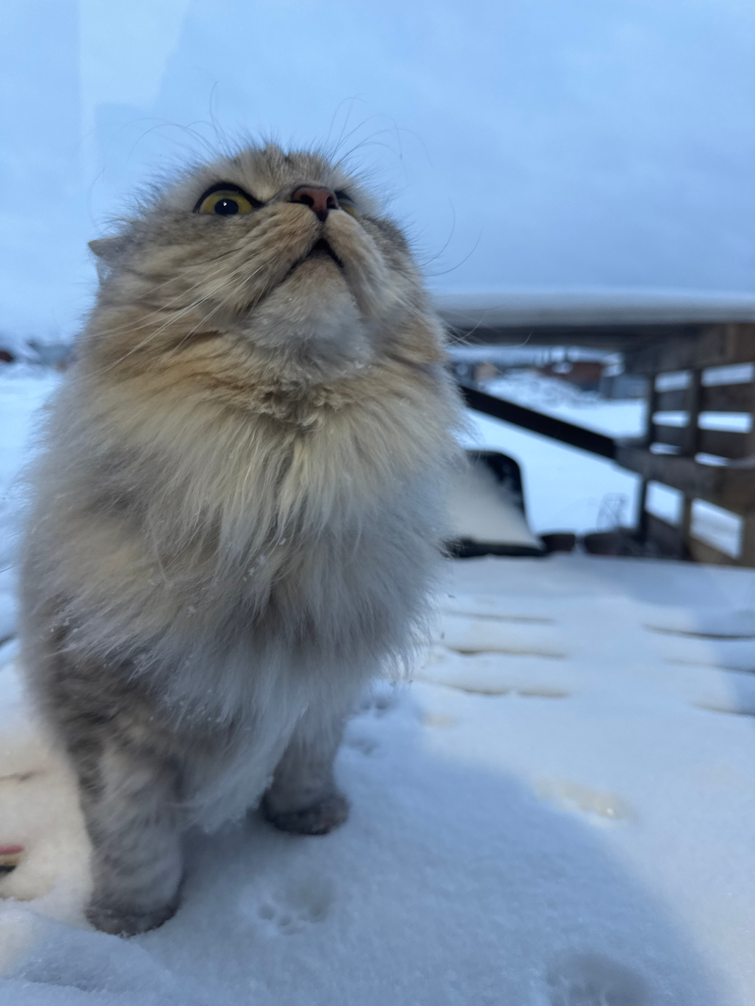 A fluffy, light-grey cat with yellow eyes stands in the snow, looking upwards. The photo appears to have been taken outdoors in Gornyi (Dvurechenskoe S/P), Russia. The background shows snow-covered gr…read more