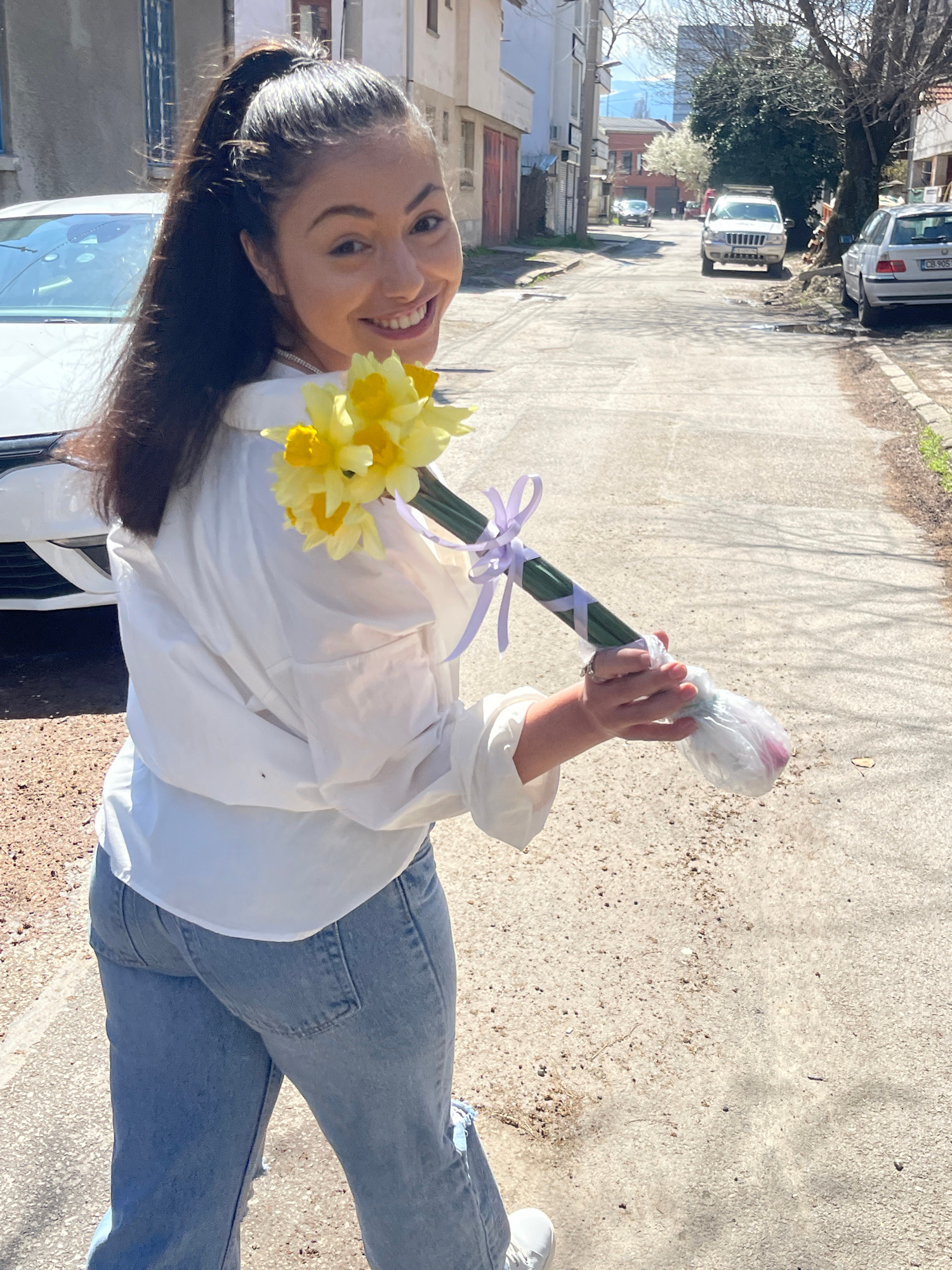 A woman in her early 20s stands on a residential street in Sofia, Bulgaria. She is holding a bouquet of yellow daffodils and a single rose wrapped in plastic. She is wearing a white collared shirt and…read more