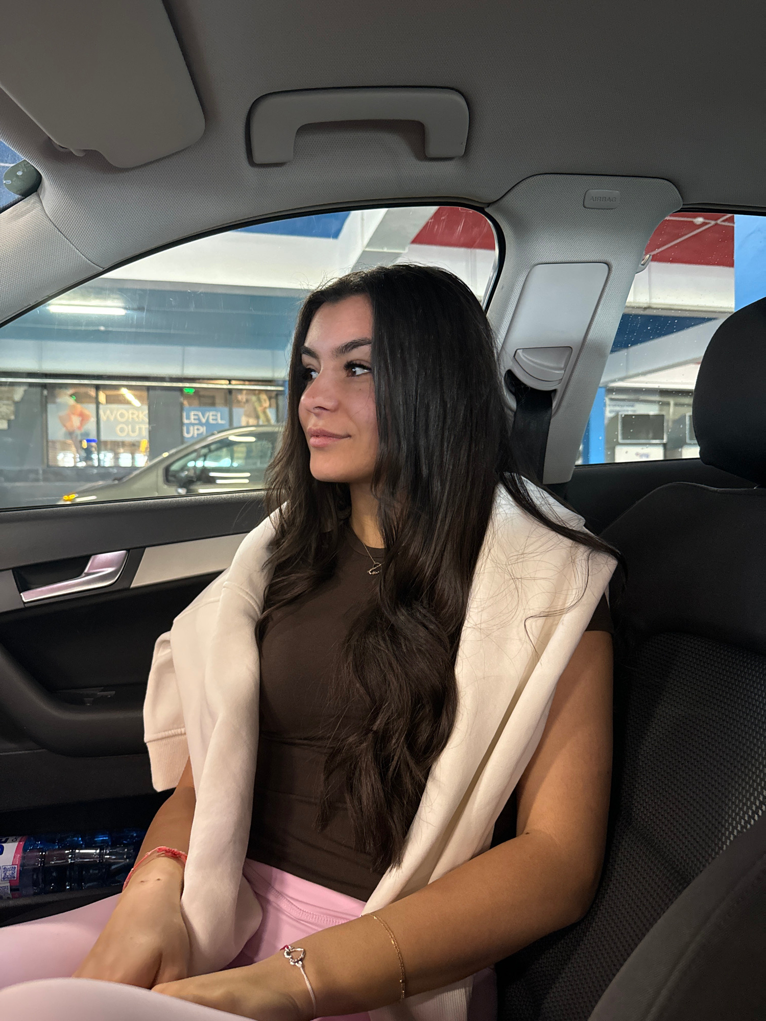 A young woman is sitting in the passenger seat of a car. She has long dark hair, a brown shirt, and a light pink sweatshirt draped over her shoulders. Her arm is visible, adorned with bracelets, and sā¦read more