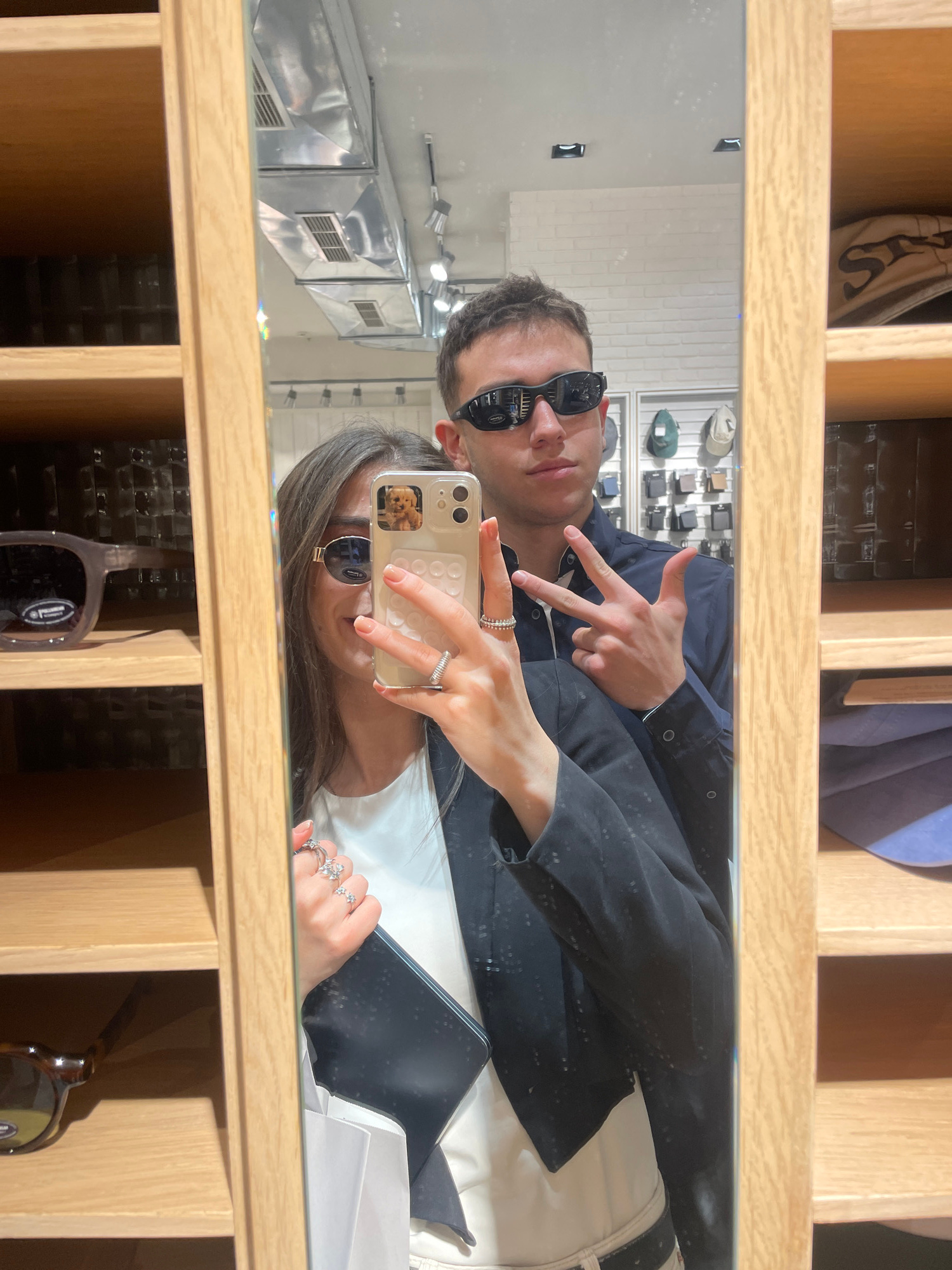 In Yerevan, Armenia, a selfie shows a man and a woman reflected in a mirror. The man wears sunglasses, a dark jacket over a collared shirt, and is making a peace sign with his fingers. The woman also…read more