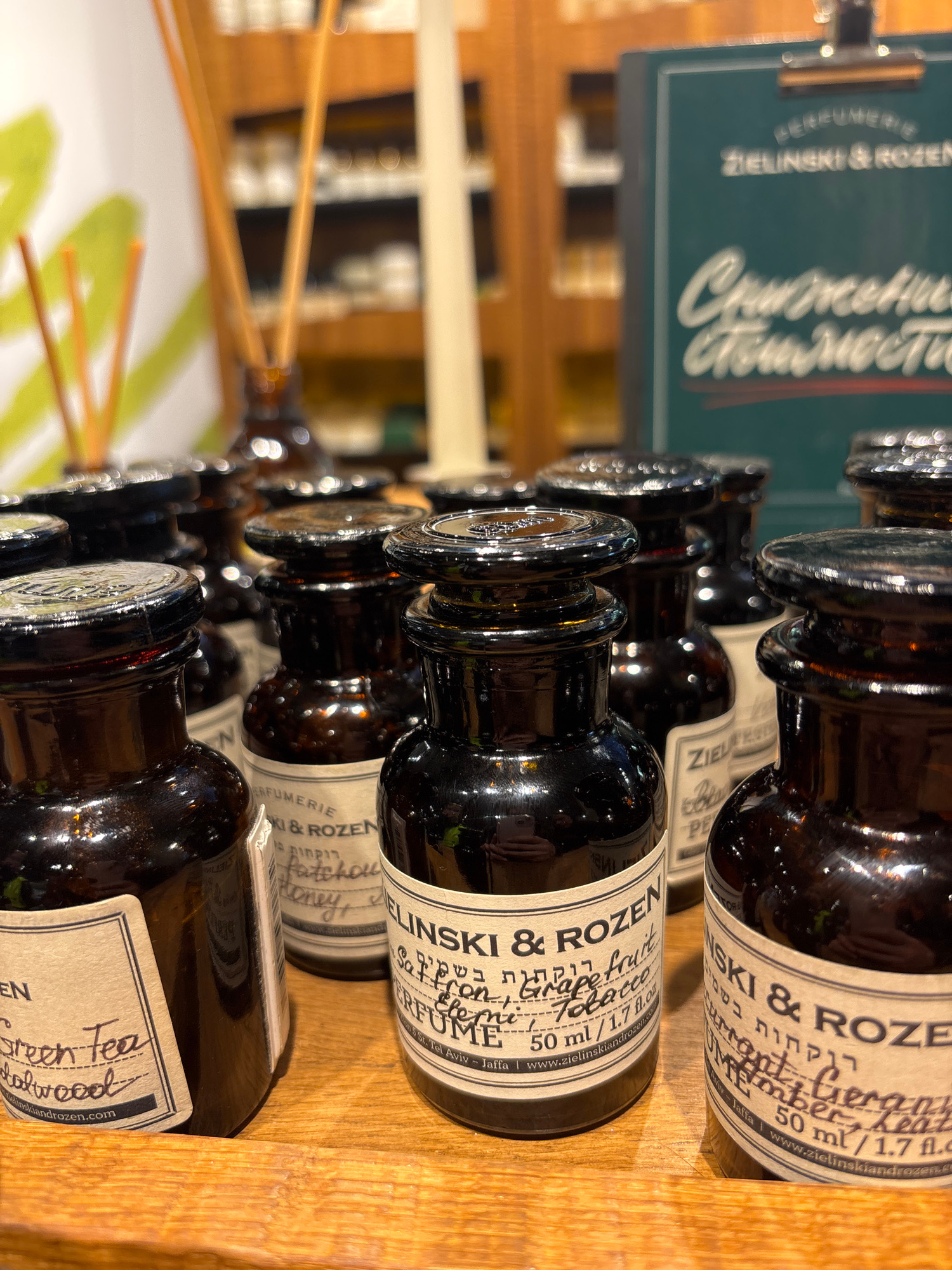 The image shows a close-up view of several small, dark amber-colored glass bottles with cylindrical bodies and clear glass stoppers. They are arranged in rows on a light-colored wooden surface. Each b…read more