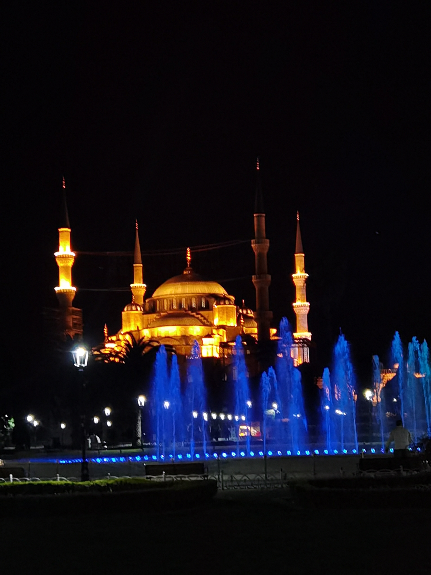 The image shows the Sultan Ahmed Mosque (Blue Mosque) in Istanbul, Turkey, at night. The mosque is illuminated in yellow, and a row of fountains in front of it are lit up in blue. Several streetlights…read more