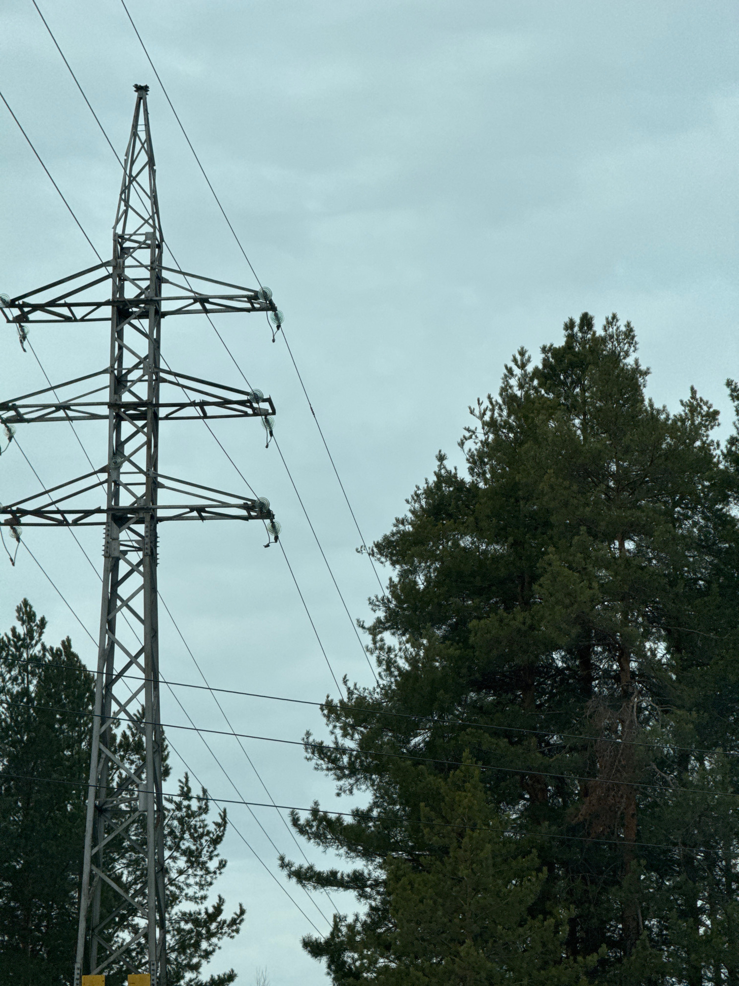 The image depicts a power line tower against an overcast sky. The tower is constructed of metal lattice and supports multiple high-voltage lines. Some tree branches are present, suggesting the scene i…read more