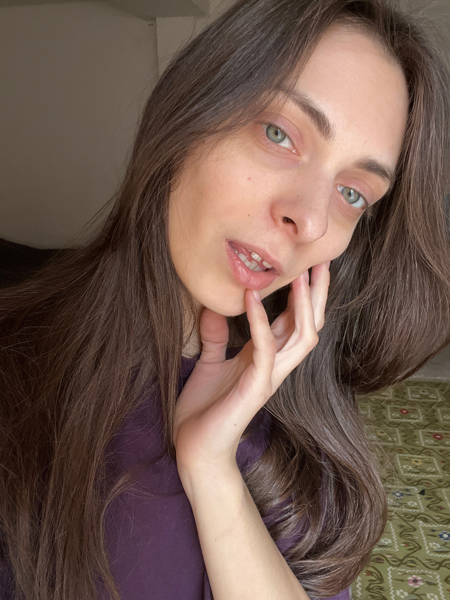 A woman with long, dark brown hair and light-colored eyes is facing the camera, her head tilted slightly. Her hand is near her face, with fingers lightly touching her cheek. She is wearing a dark purp…read more
