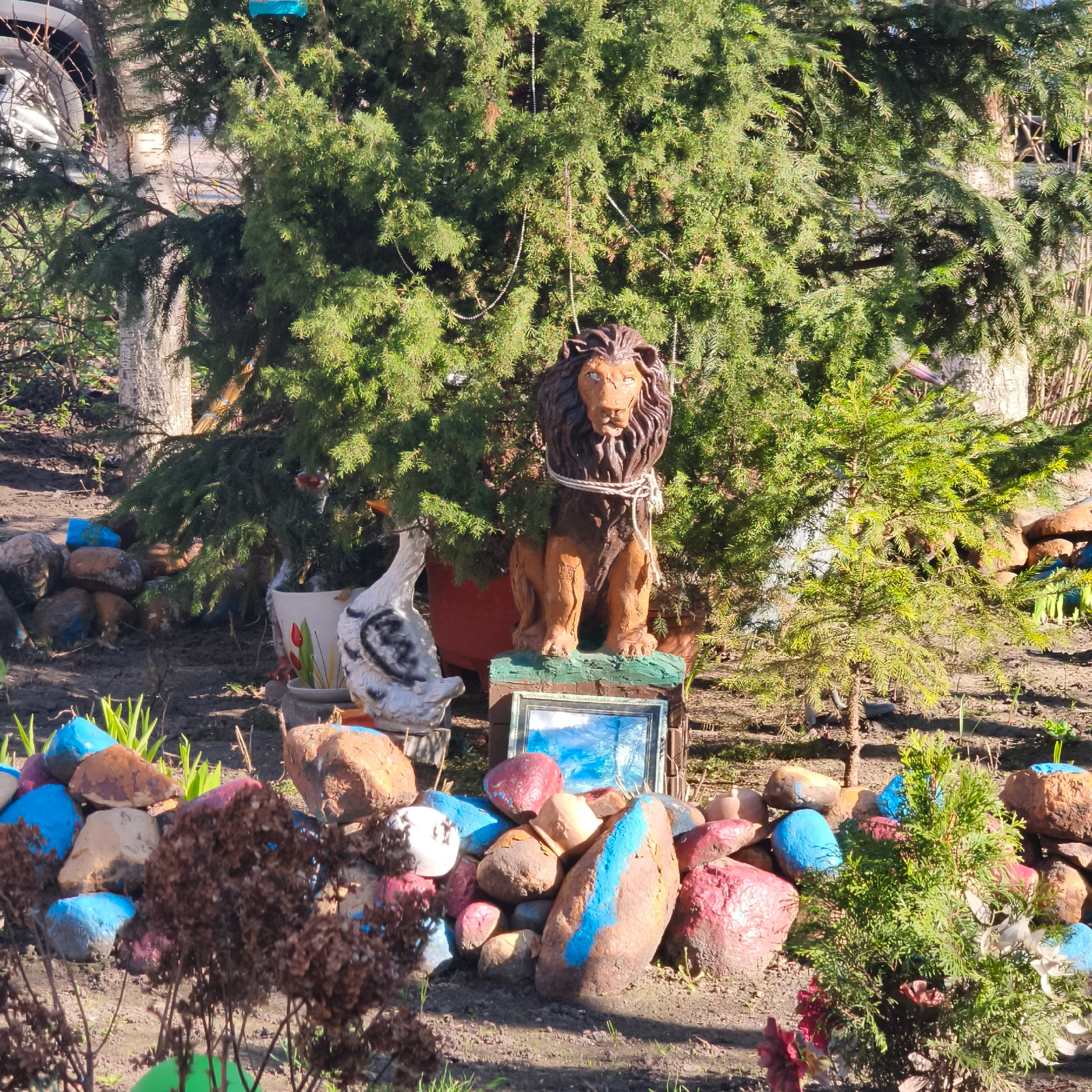 In Hrodna, Belarus, a garden scene is captured in daylight. At the center, a brown, seated lion statue with a light-colored rope around its neck is positioned on a small, green platform. To its left,…read more