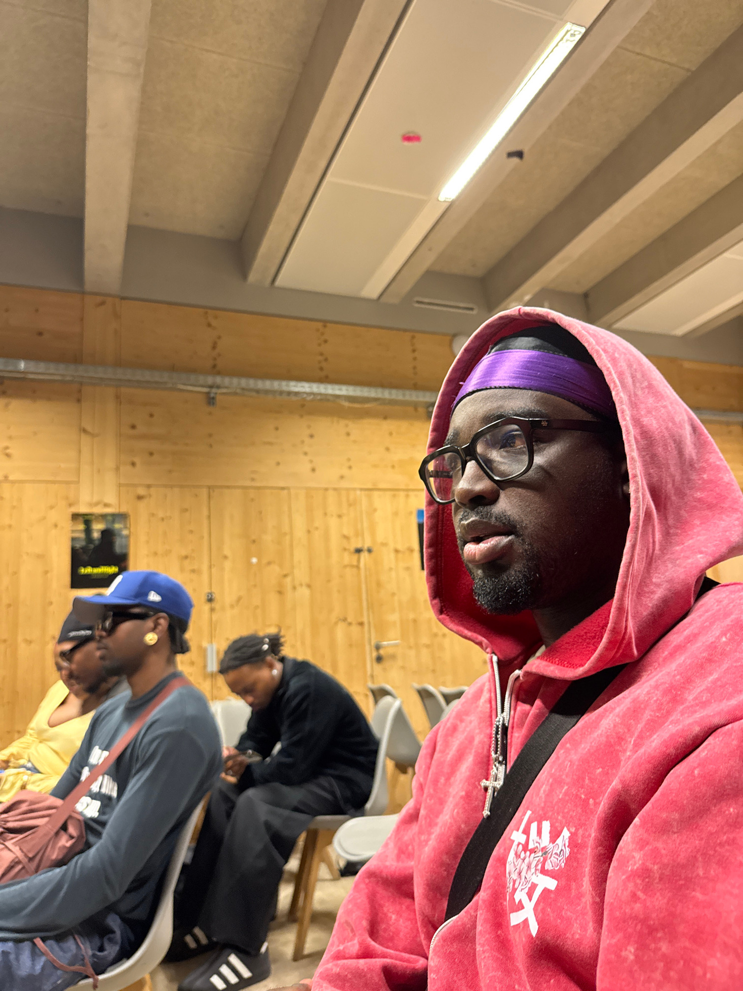 A medium shot depicts a Black male wearing a pink hoodie, glasses, and a purple head covering. He is positioned in the foreground of the image. Behind him, in the middle ground, are two other individu…read more