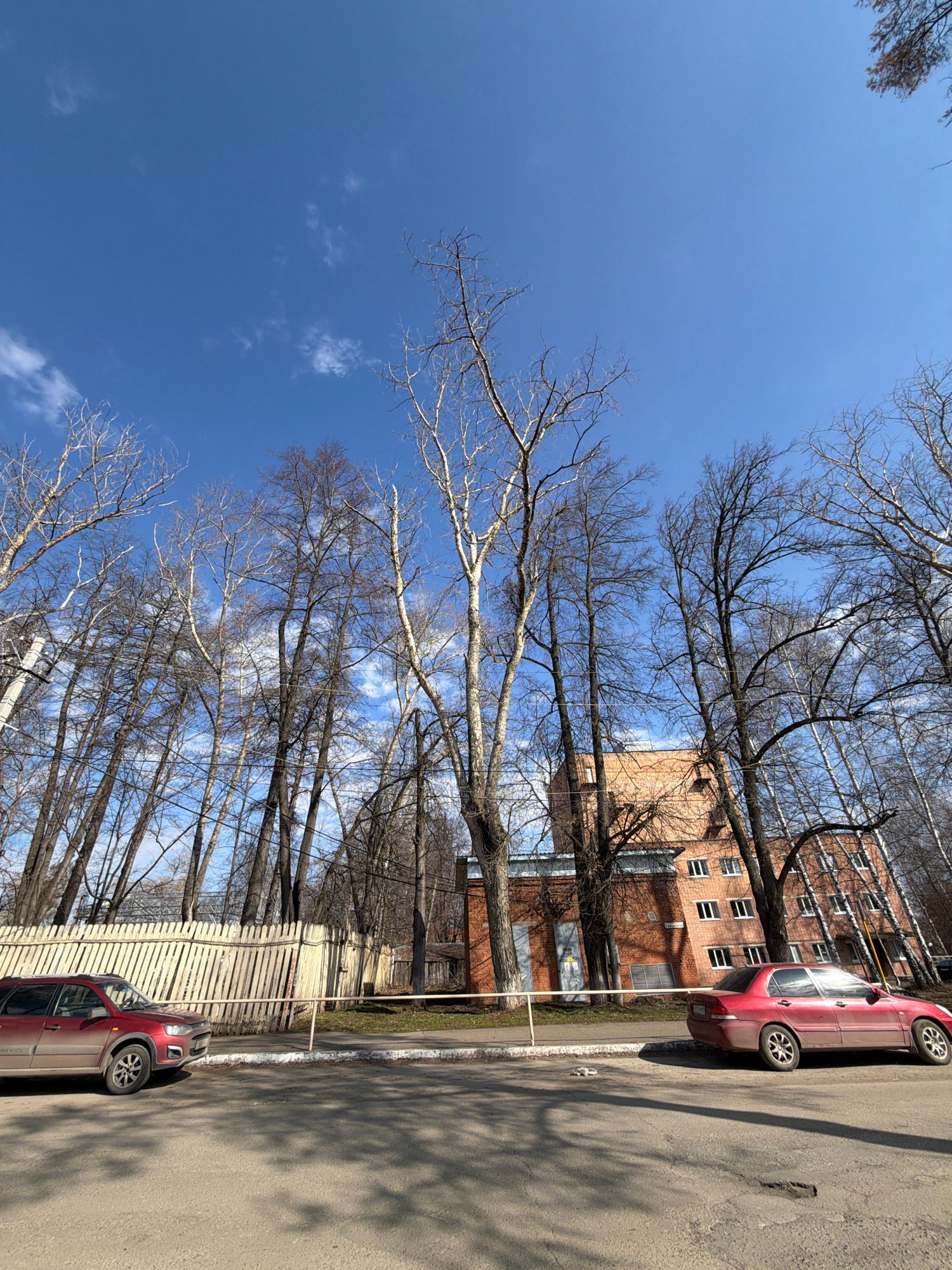 The image depicts a sunlit outdoor scene in Sarapul, Russia, characteristic of late winter or early spring. A clear, vibrant blue sky with scattered wispy white clouds forms the backdrop. Numerous dec…read more