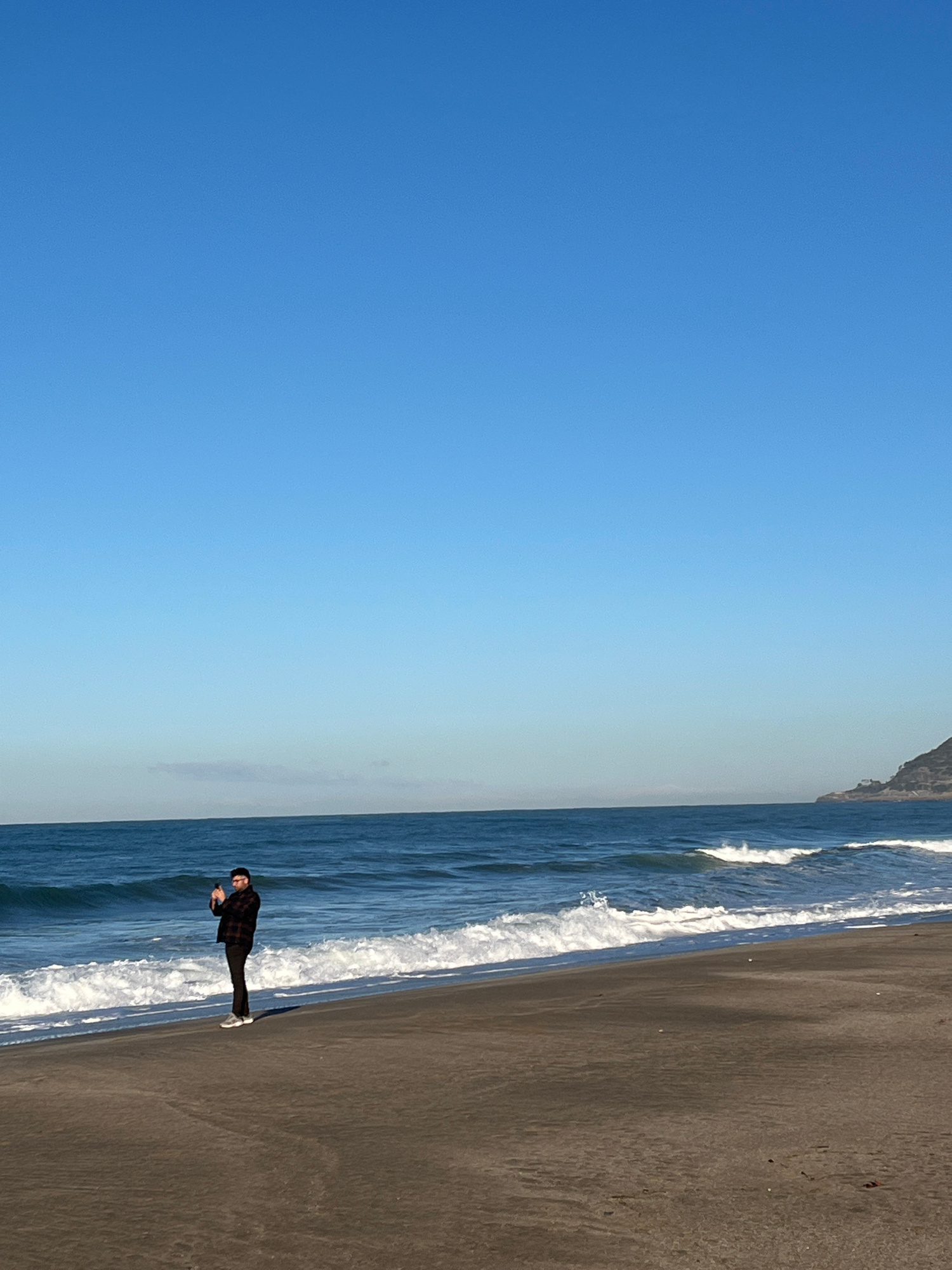 A wide-angle shot of a beach featuring a man in dark clothing and white shoes standing at the shoreline. Waves are breaking on the beach. The sky is clear blue. There is a headland or mountain visible…read more