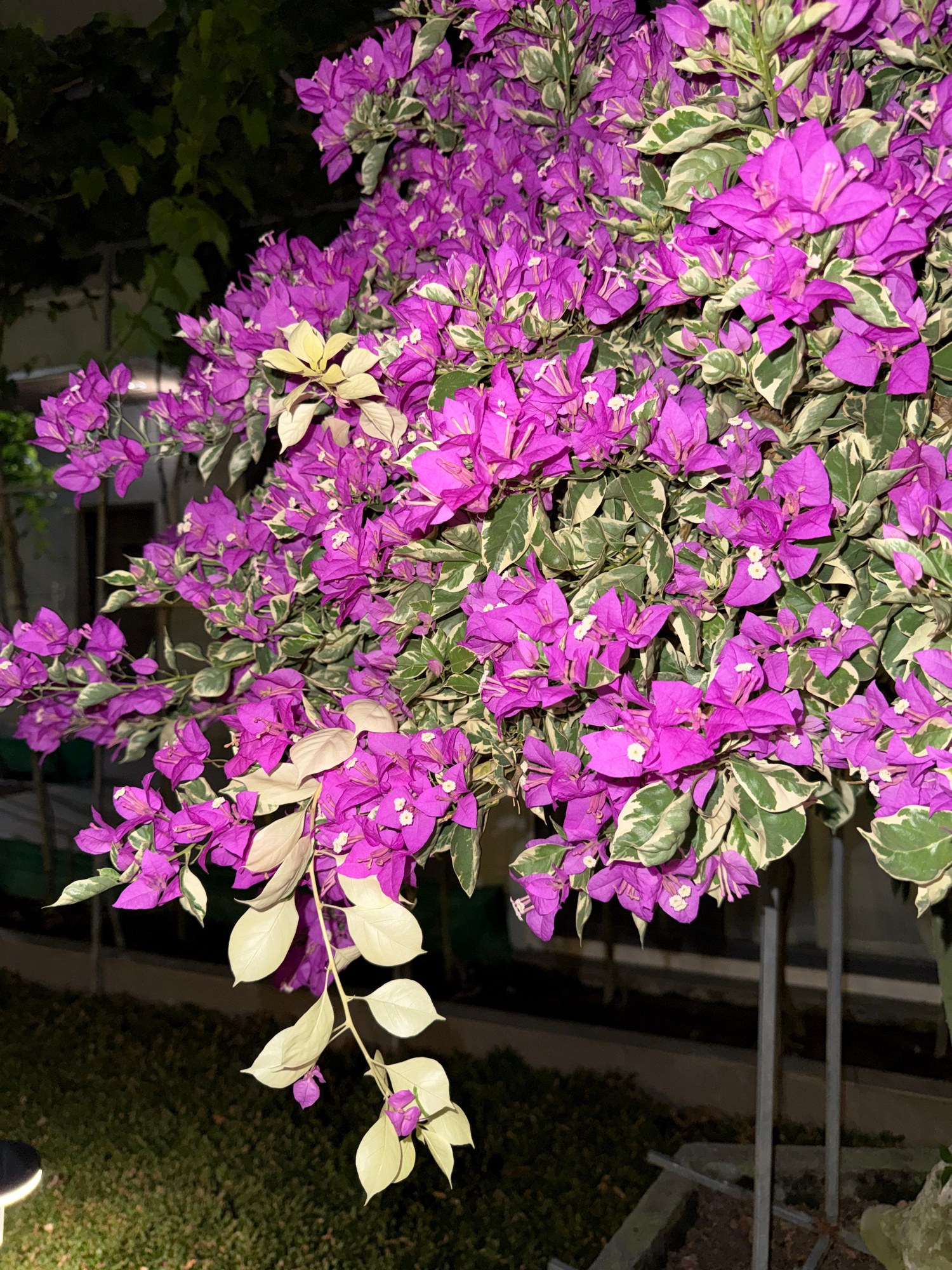 A close-up, slightly low-angle shot captures a cluster of vibrant purple bougainvillea flowers intermingled with variegated green and white foliage. The plant appears to be hanging or climbing downwar…read more