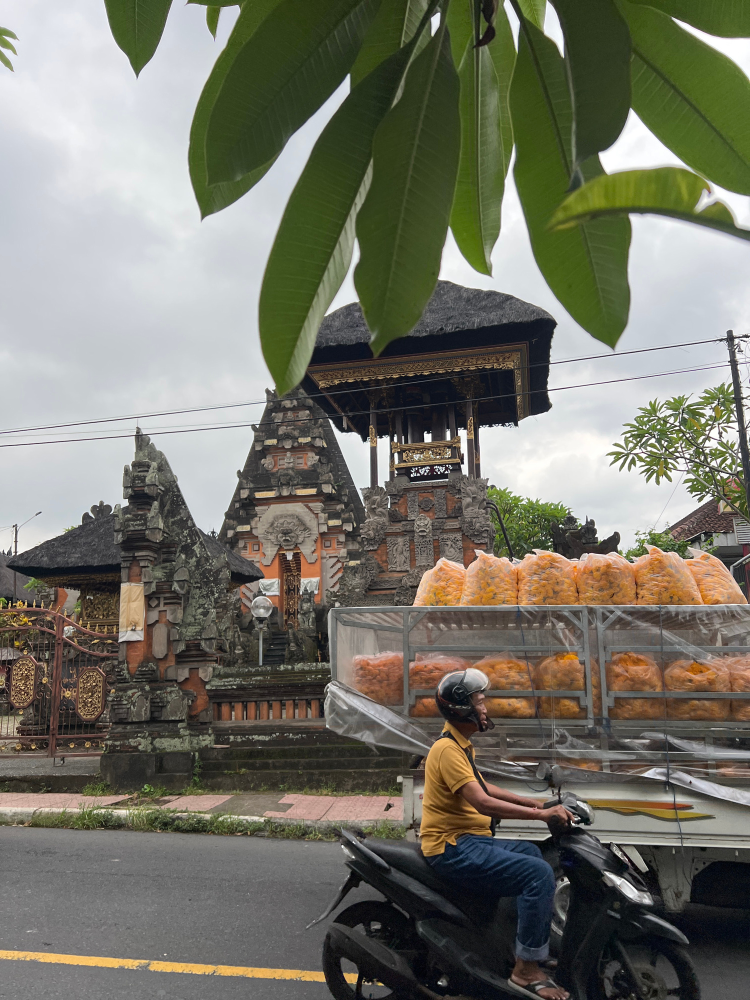 The image, correctly oriented, presents a bustling street scene in Ubud District, Indonesia, blending everyday activity with traditional Balinese architecture. In the mid-ground, a person, likely a ma…read more
