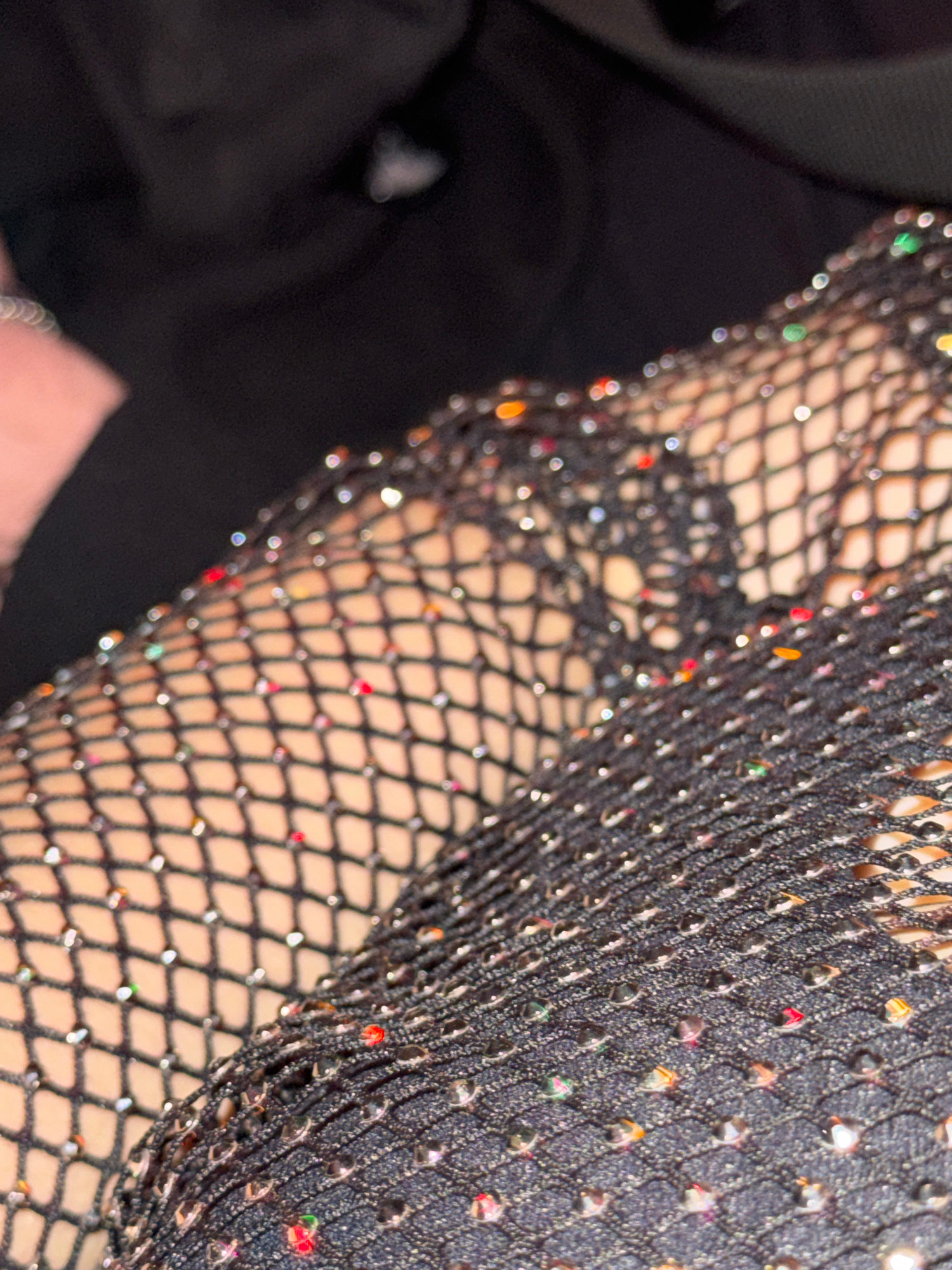 The image shows a close-up of a person's arm covered in black fishnet fabric with small, colorful sequins. The background is blurry and mostly black. No information is discernible to suggest the sceneβ¦read more