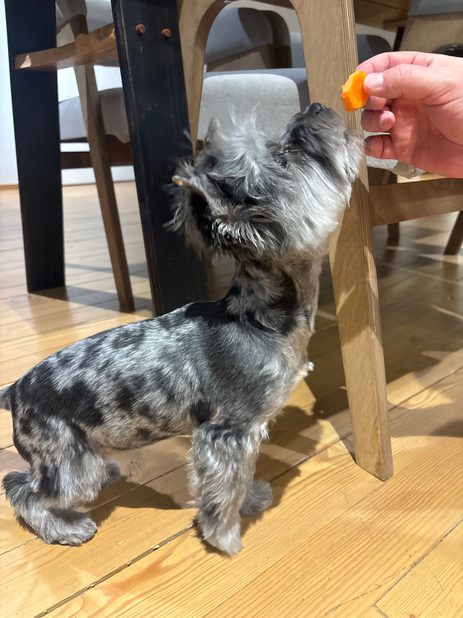 A medium shot captures a person's hand offering an orange piece of food to a gray Schnauzer dog. The dog stands on a light gray chair, its head tilted up, anticipating the treat. The setting appears t…read more