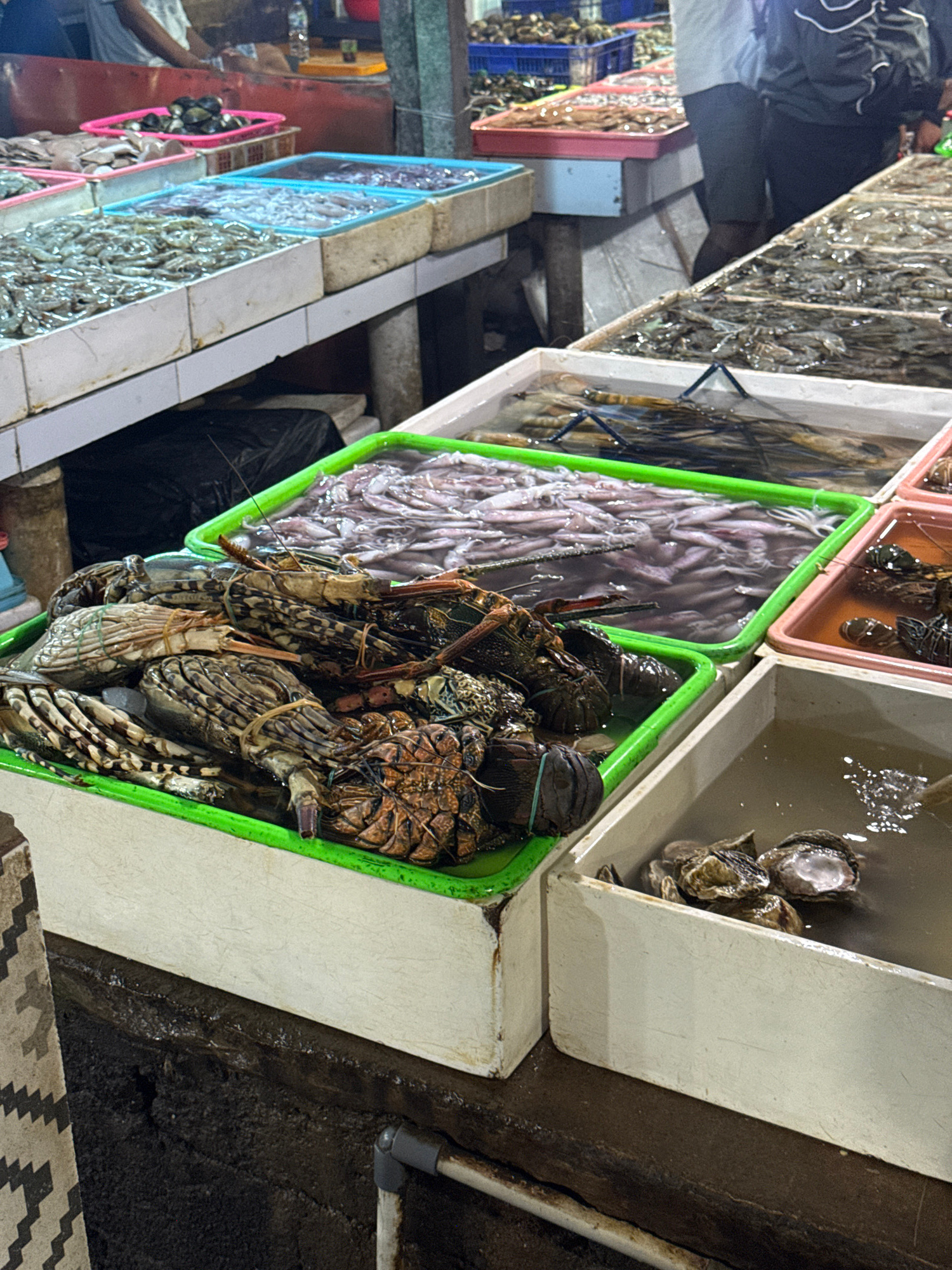 The image depicts a bustling seafood market stall, likely in Kuta, Indonesia, as indicated by the provided context. The photograph is oriented on its side, showing a long display of fresh seafood laid…read more
