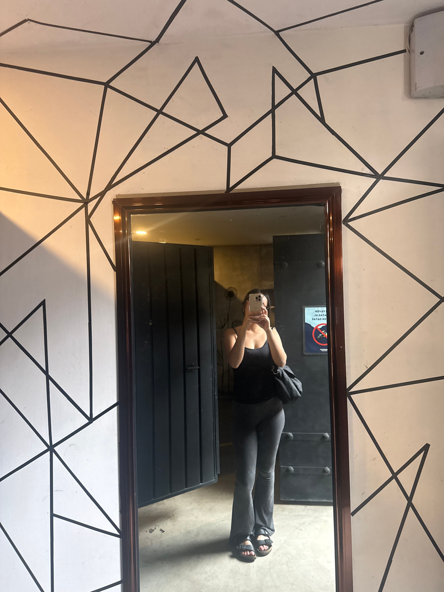 A person is visible in the reflection of a rectangular mirror with a brown frame that is attached to a wall with a geometric black and white design. The person is holding a smartphone and appears to b…read more