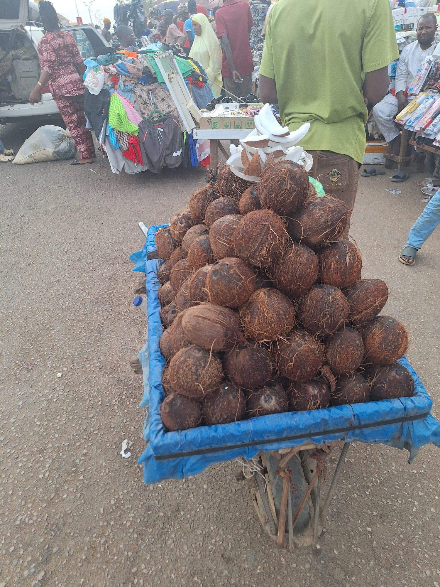 The image depicts a scene in Sabon Tasha, Nigeria, showing a pile of coconuts loaded in a blue, cloth-lined wheelbarrow on a paved street. The coconuts are brown and hairy, tightly packed together. A…read more