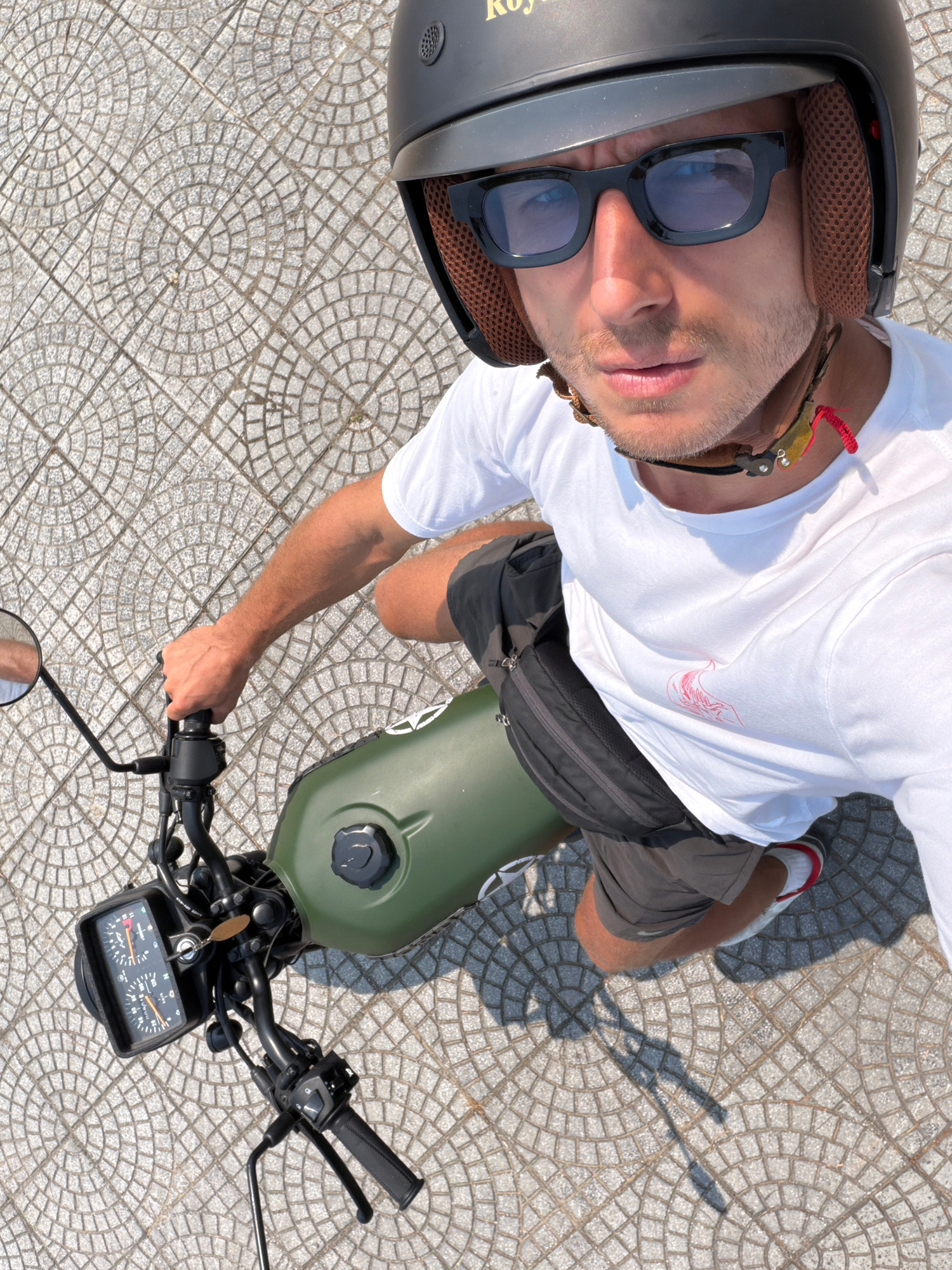 A high-angle, full shot of a man on a green motorcycle on a patterned, grey-tiled surface. The man wears a black helmet with brown lining, sunglasses, a white t-shirt, and dark shorts with a black fan…read more