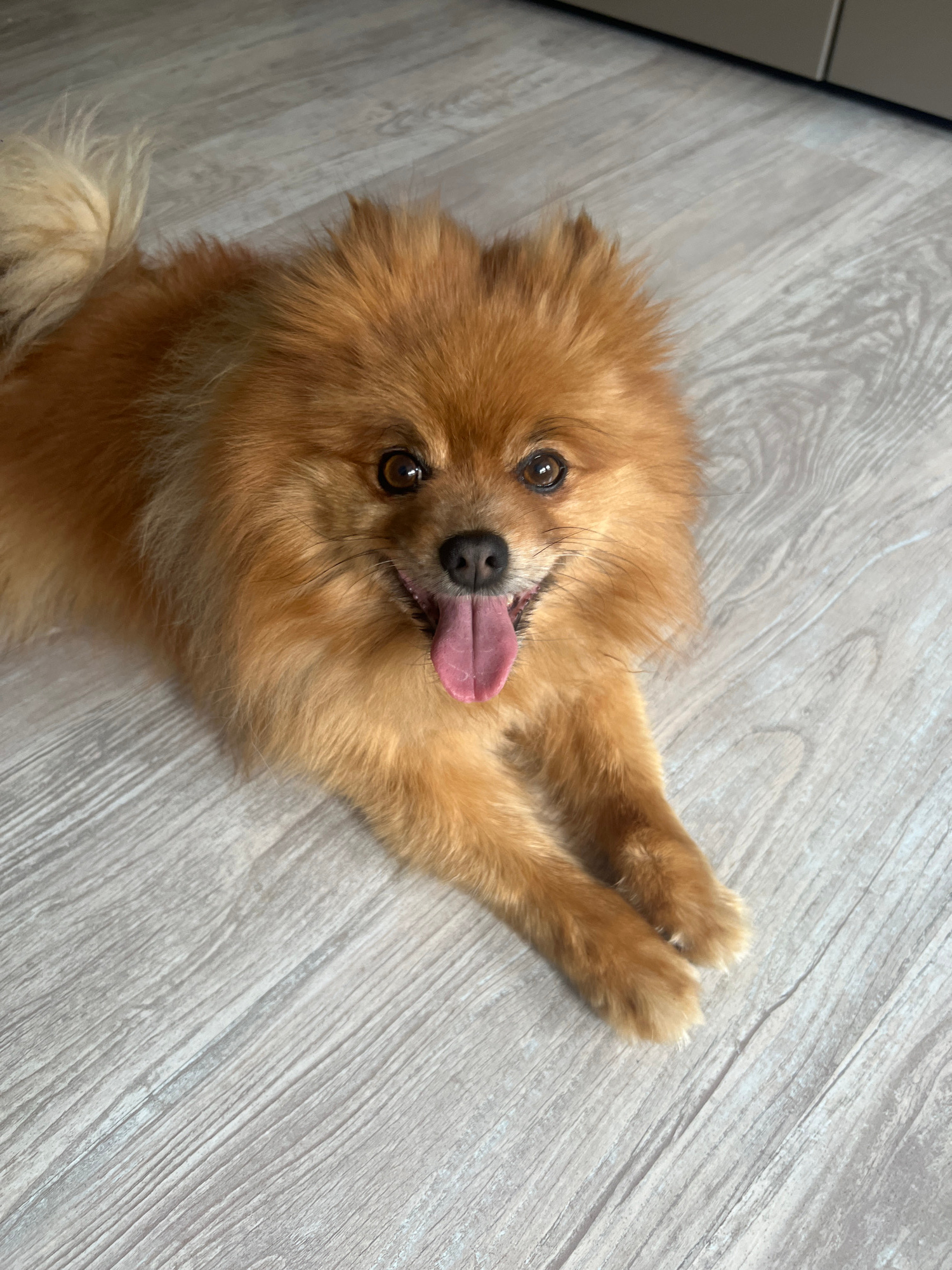 A reddish-brown Pomeranian dog is observed lying prone on a light gray wood-grain laminate or plank floor. The dog's head is oriented towards the camera, presenting a full facial view. Both dark brown…read more
