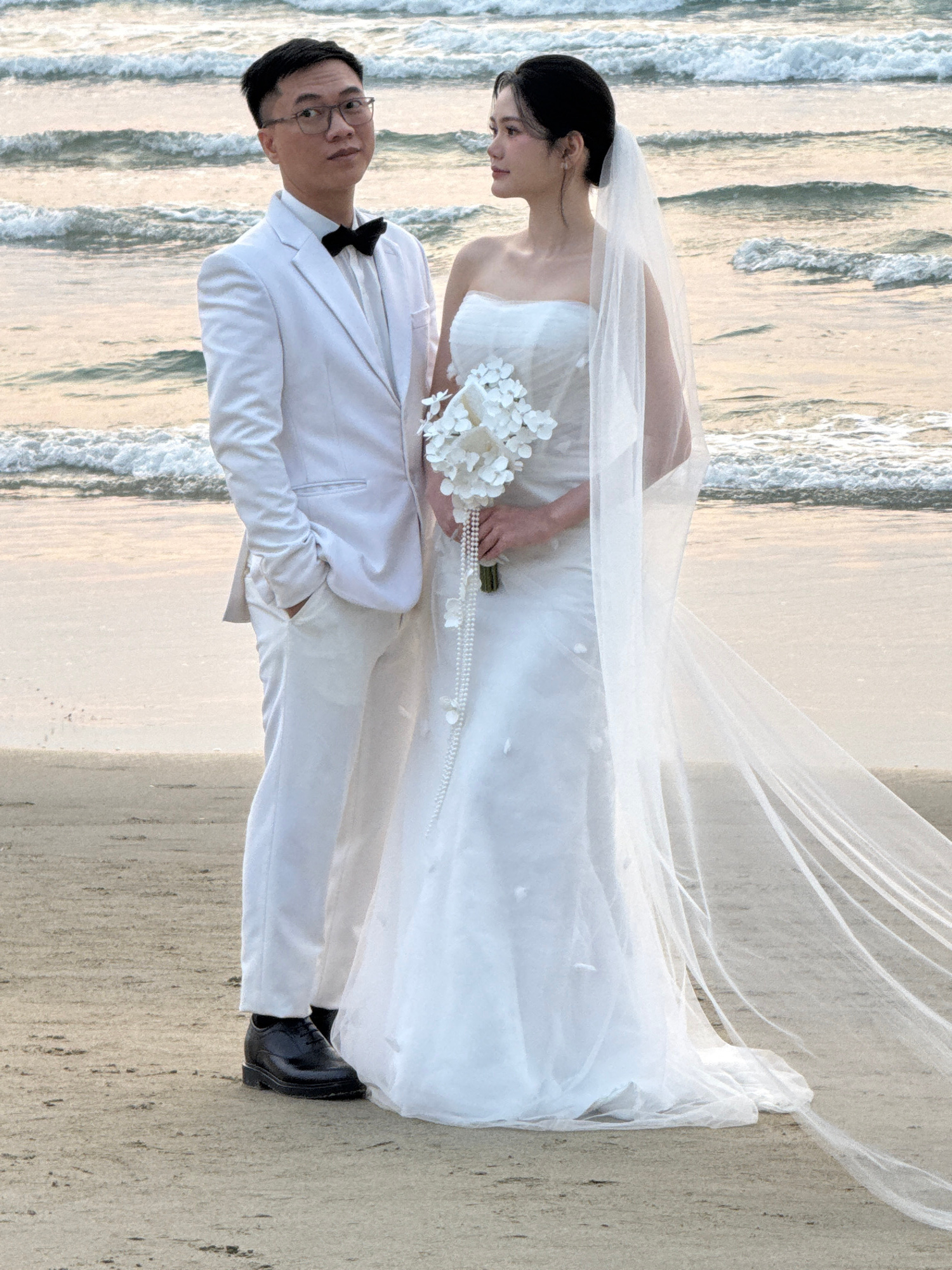 A wedding photo depicts a bride and groom on a sandy beach with waves in the background. The bride wears a white strapless wedding gown and a long veil. She is holding a bouquet of white flowers. The…read more