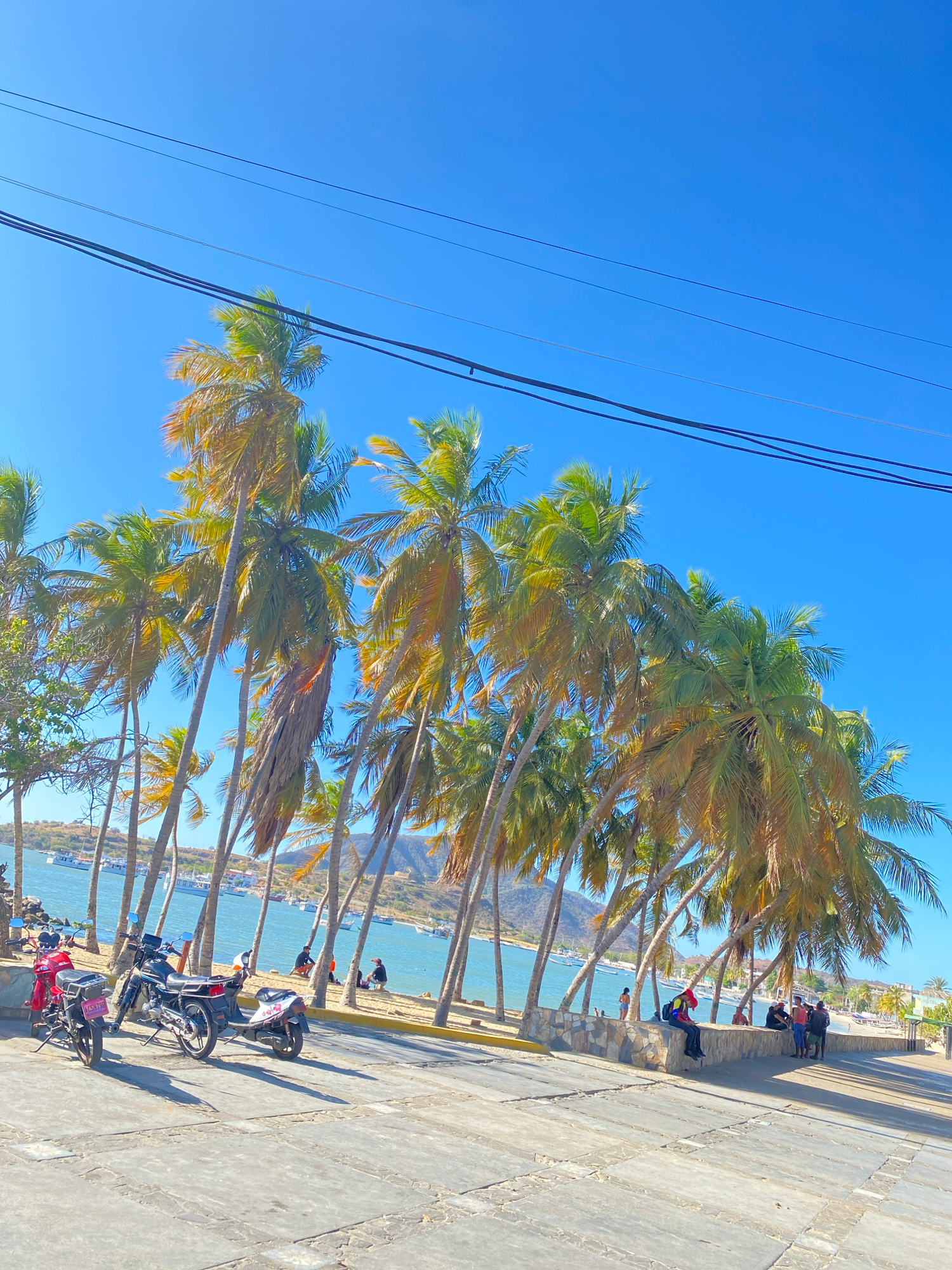 The image depicts a sunny coastal scene in Juan Griego, Venezuela. The foreground features a concrete paved area, displaying visible seams and minor wear. Three motorcycles are parked on this surface:…read more