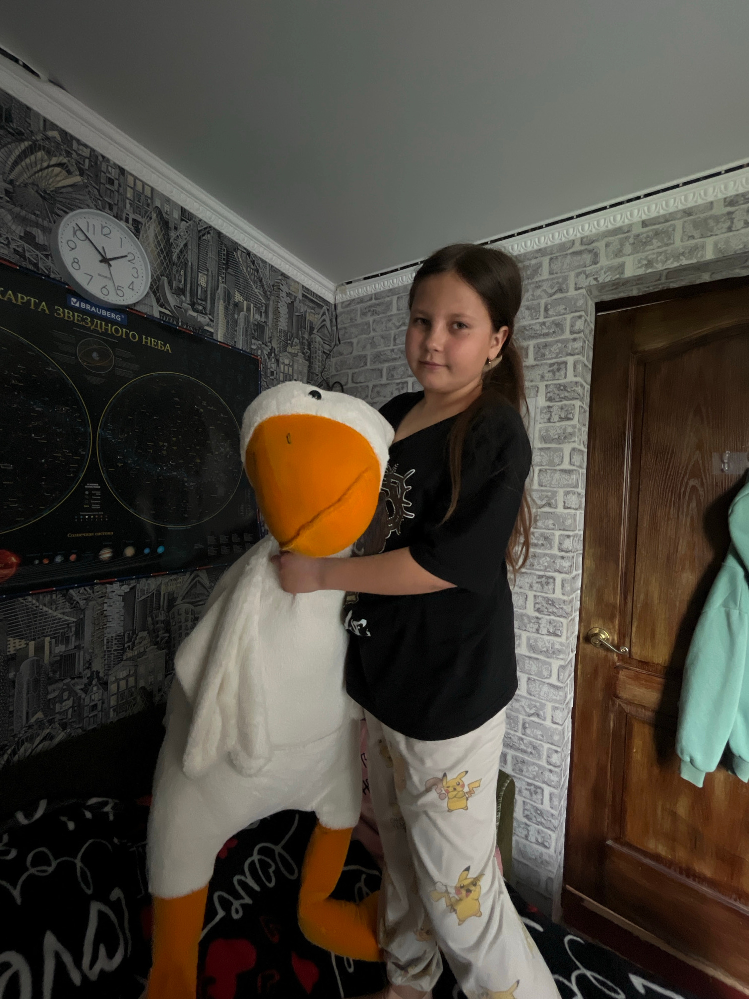 A girl is lying on top of a large plush goose, resting her torso on its back and gripping its neck. She has long brown hair and is wearing a black t-shirt and light-colored pajamas patterned with Pika…read more