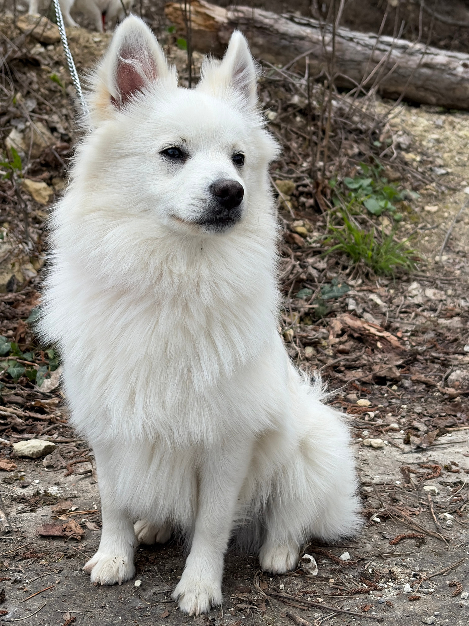 A white dog with pointed ears lies on a mix of dirt, leaves, twigs, and small rocks. The dog is facing toward the camera. A leash is visible near the dog's neck. The location is unspecified.
