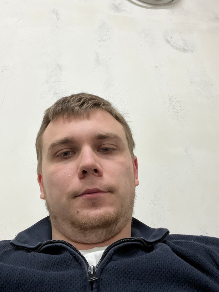 A close-up portrait of a fair-skinned man with short blonde hair and a light beard. He looks directly at the camera with a neutral expression. He is wearing a dark blue zip-up hooded sweatshirt. The b…read more