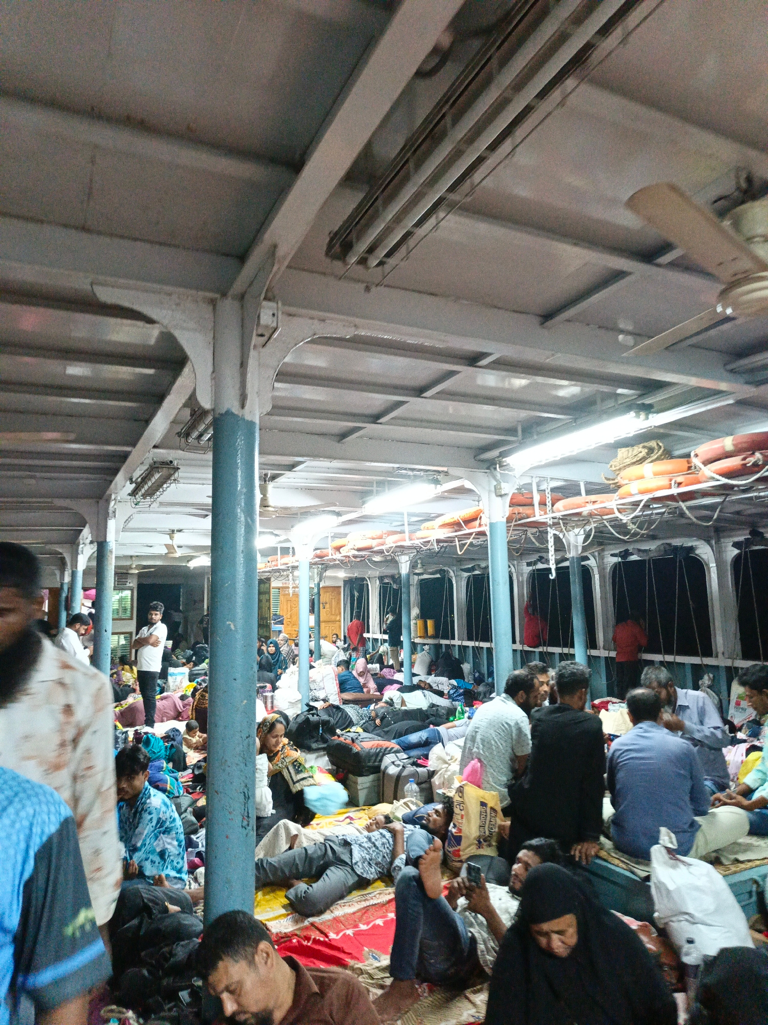 The image depicts the interior of a ferry in Goshairhat, Bangladesh, filled with people. The ferry's structure is visible, including metal beams, columns, a ceiling with fluorescent lights, and ceilin…read more