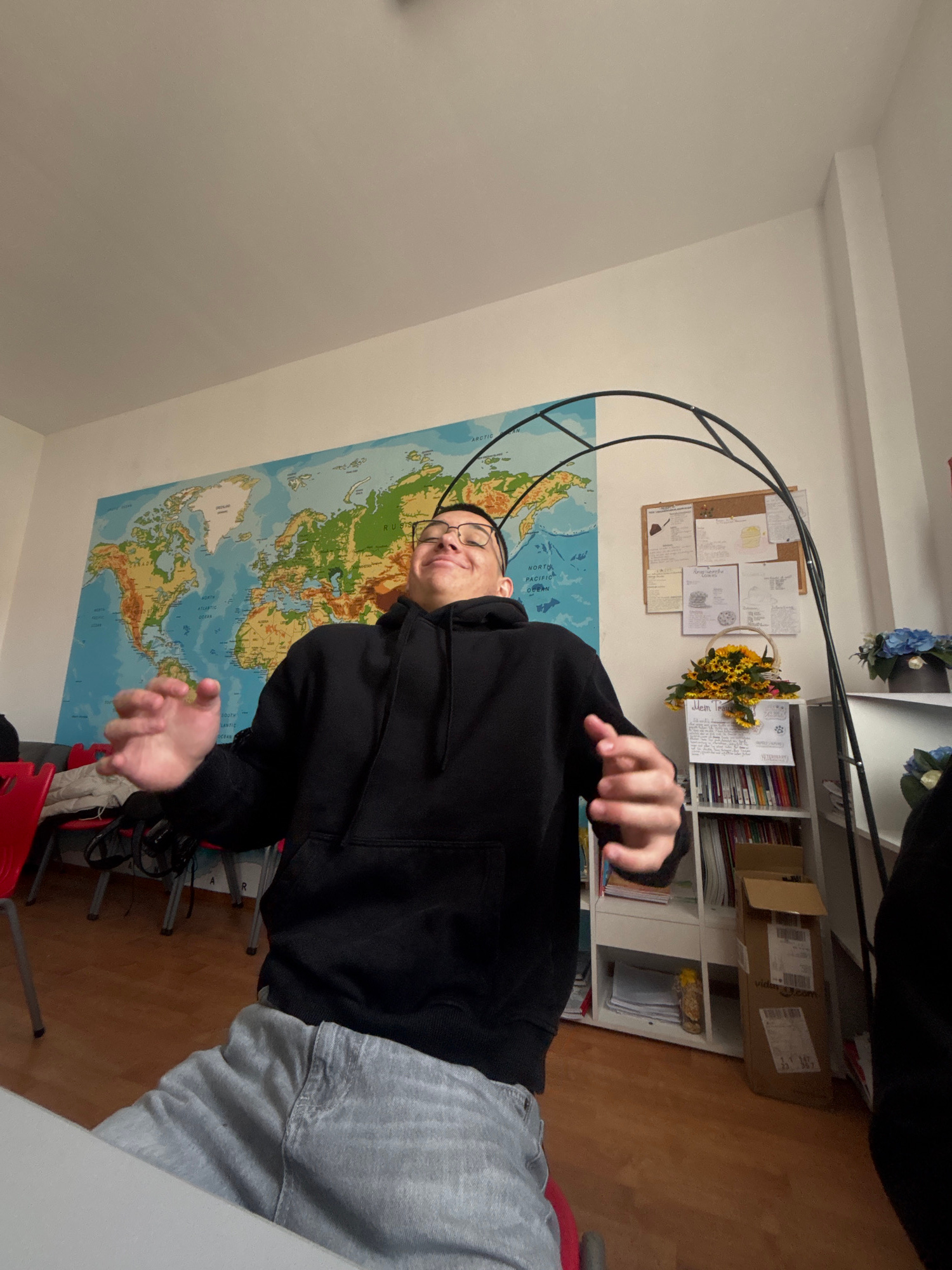 This sideways-oriented image captures a young man in what appears to be a classroom or study room, likely in Zlatograd, Bulgaria. The central subject is a young man with short dark hair and glasses, w…read more