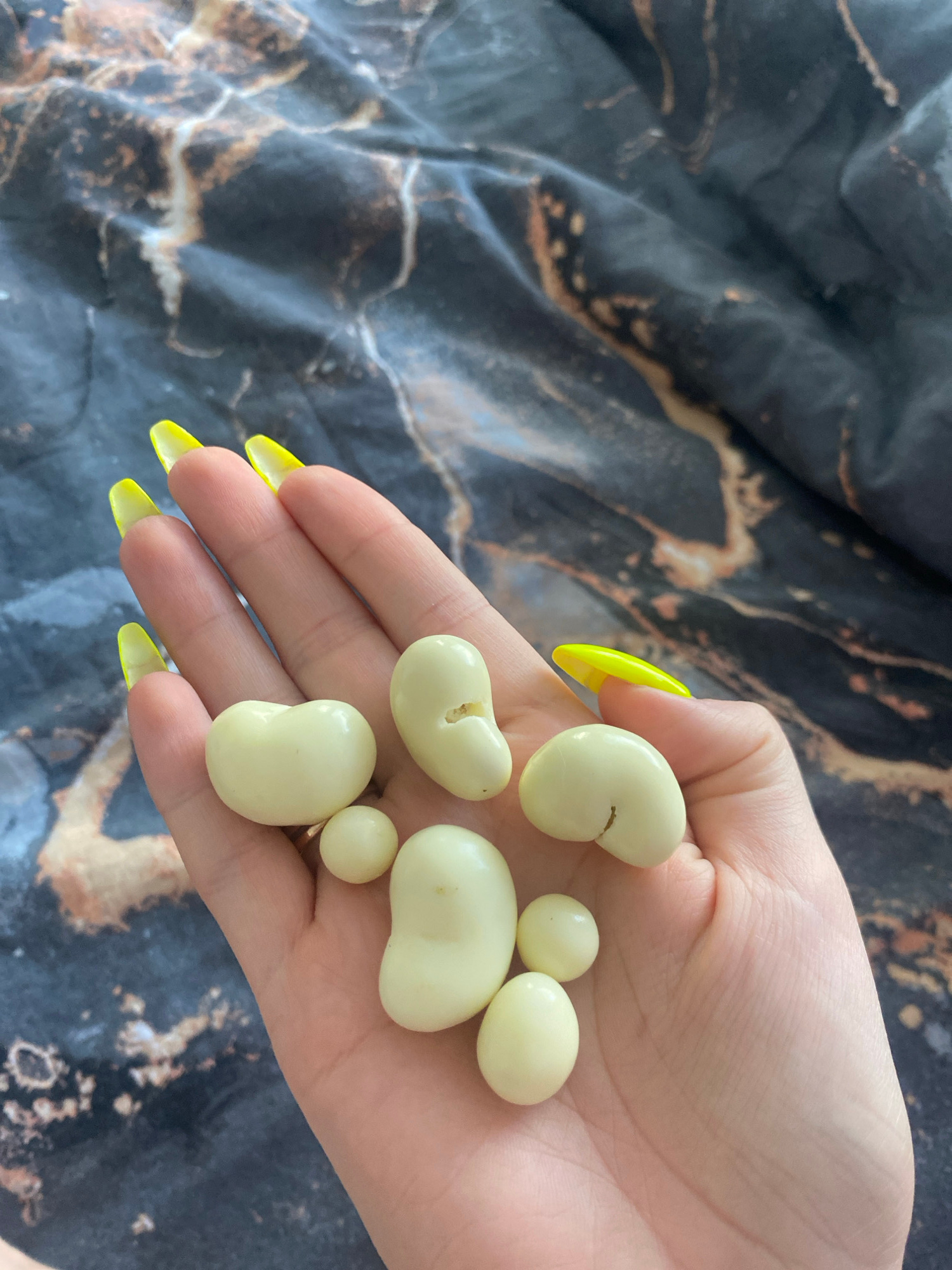 A close-up shows a pale hand with long, bright yellow nails holding several white, kidney-bean shaped objects and small white spheres. The objects are arranged somewhat in the shape of a paw print. Th…read more