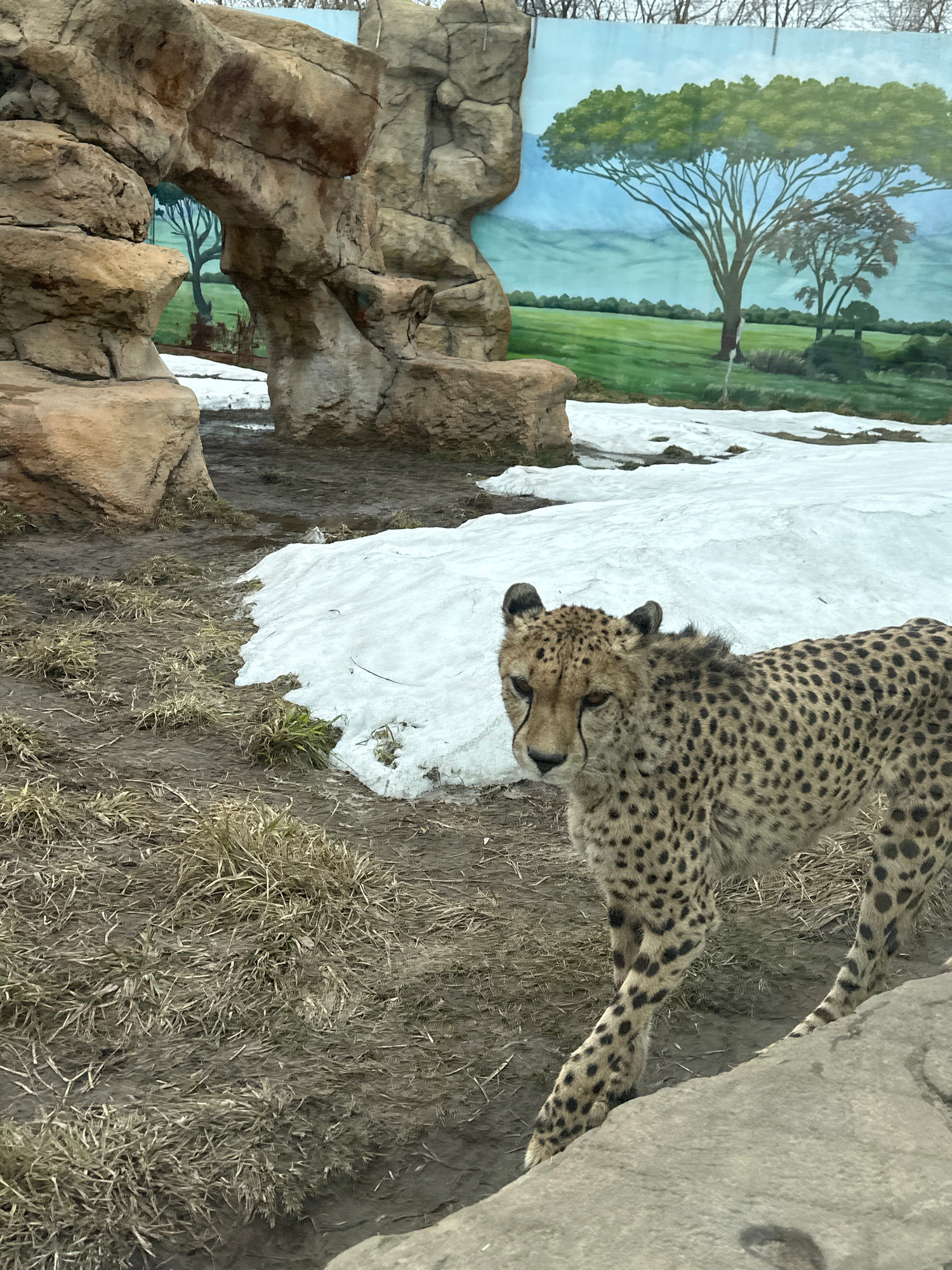 A cheetah is lying on a grassy, rocky surface near a patch of snow. Behind it is a painted backdrop depicting trees and a landscape. The photograph was taken at the Kazan Zoo in Kazan, Russia.