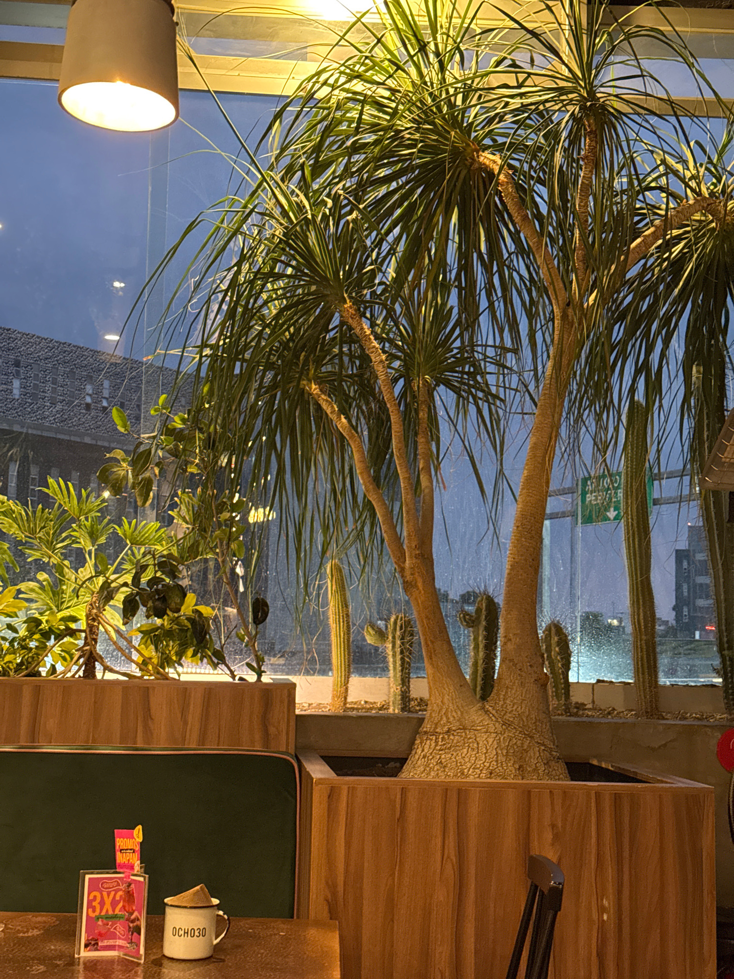 The image depicts an interior scene with a large potted Beaucarnea recurvata (Ponytail Palm) in front of a window. The window offers a view of Puebla, Mexico, characterized by a modern high-rise build…read more