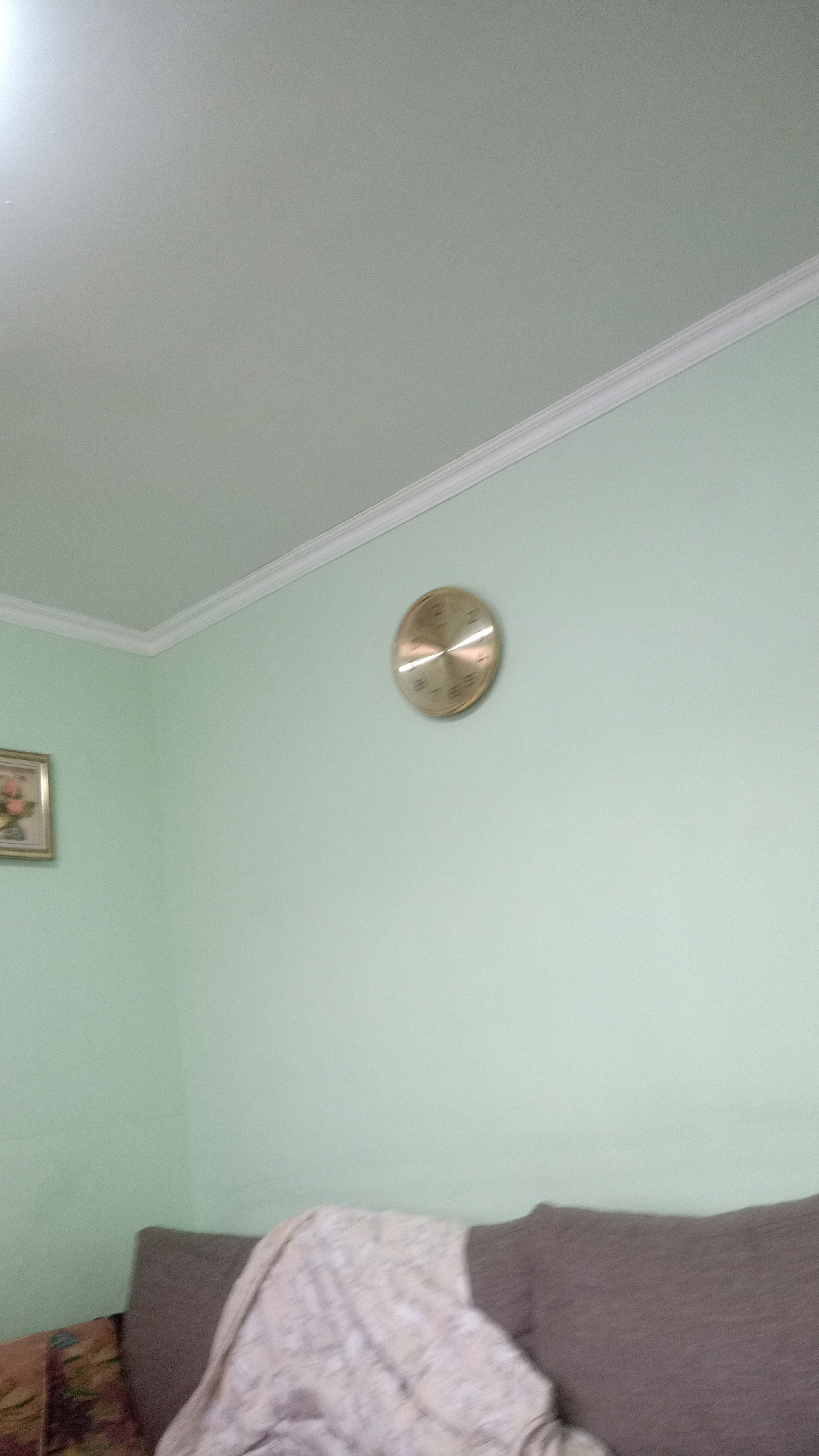 The image shows an interior view of a room. The walls are painted a light green color with white trim along the ceiling. A round, gold-colored clock is mounted on the right wall. To the lower left, th…read more