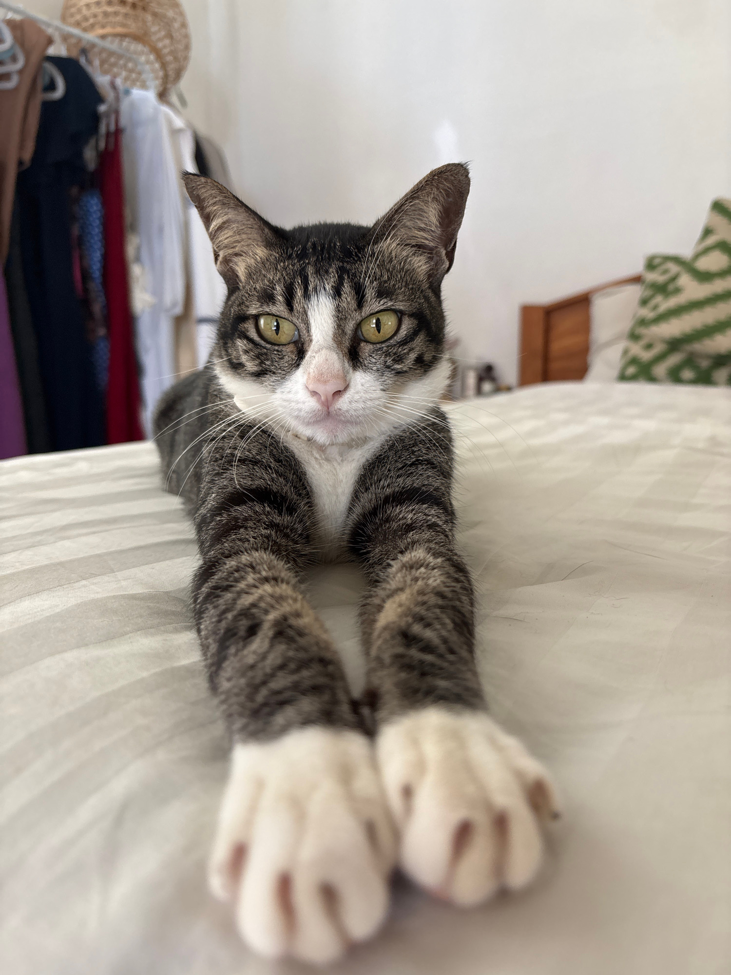 An indoor, eye-level shot captures a tabby cat lying on its back or side on a bed with white striped sheets. The cat, predominantly grey and brown striped with white markings on its chest, paws, and f…read more